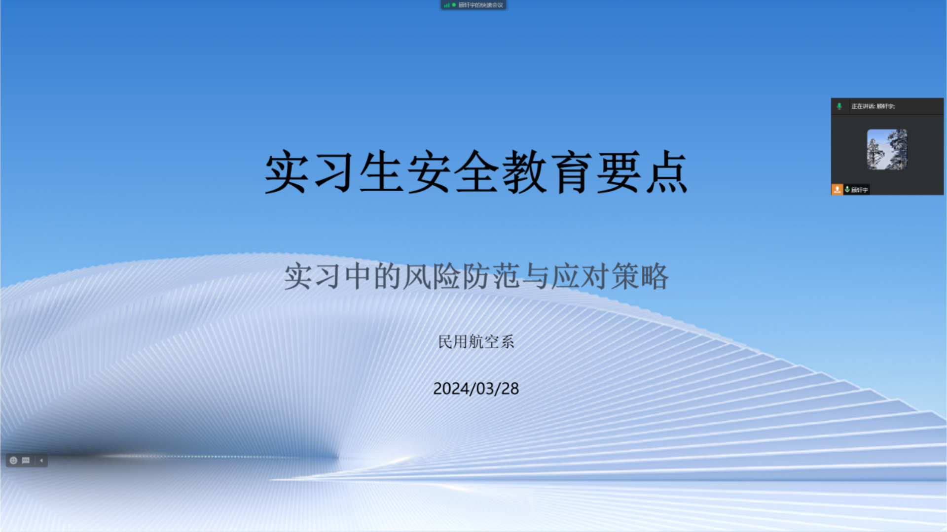 为进一步提升学生在实习期间的自我保护和安全防范意识,杜绝各类安全隐患,民用航空系于3月28日下午召开线上“实习安全教育主题会议”,会议由辅导员顾轩宇主讲。
