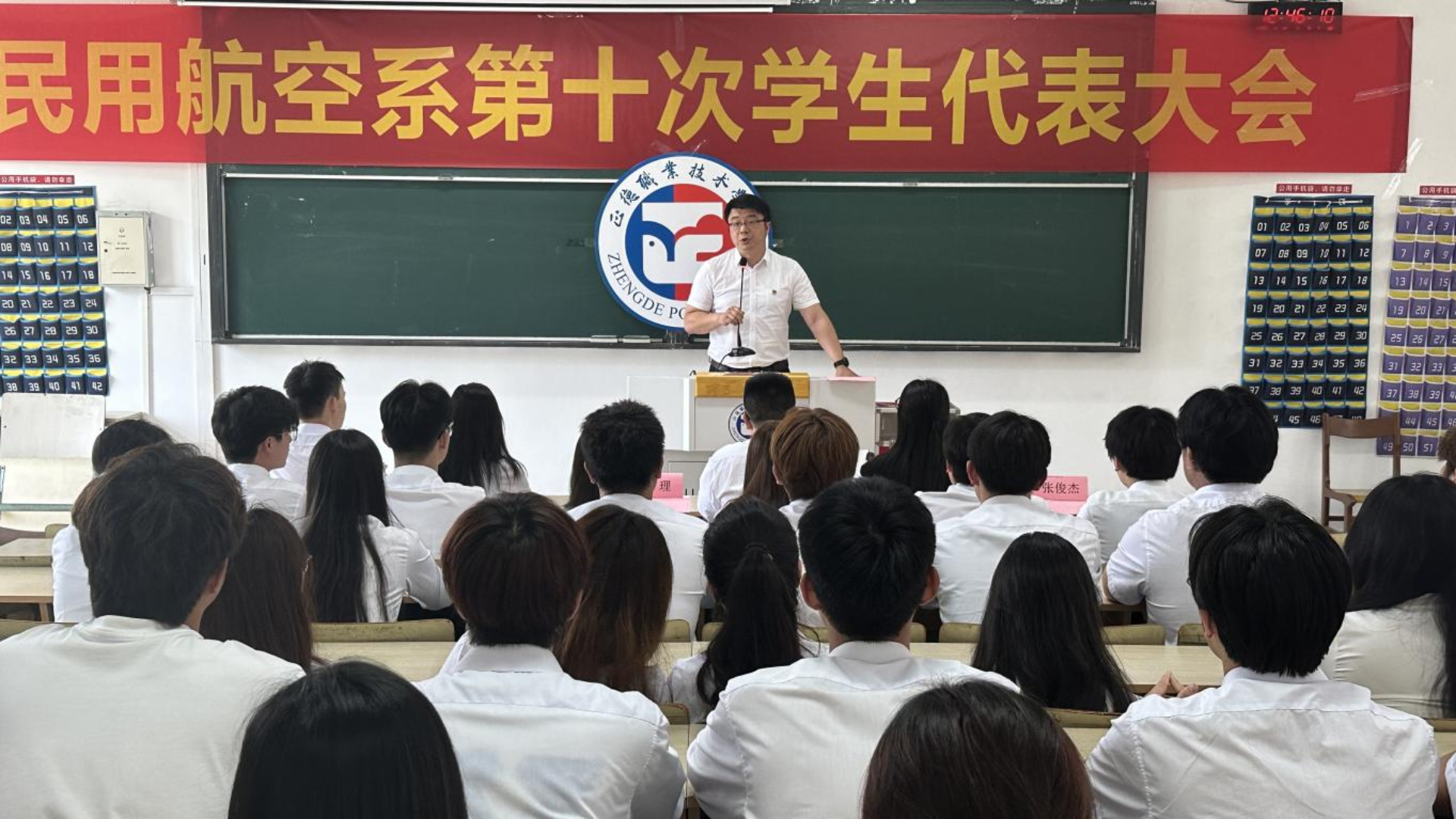 随后,院学生会主席刘一博发表讲话。他高度赞扬了民用航空系学生会在学院学生组织中的模范带头作用,并希望他们继续保持积极向上的精神风貌,不断追求卓越。同时,他也祝愿本次大会取得圆满成功,为民用航空系的学生工作注入新的活力。
