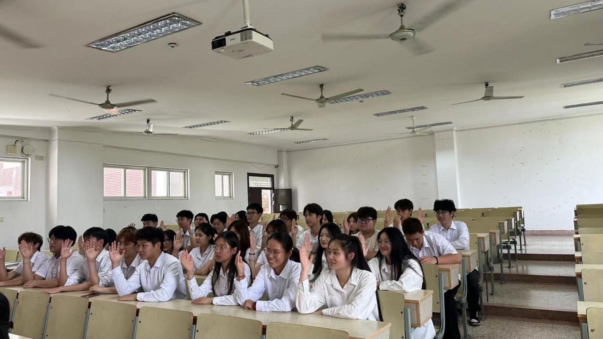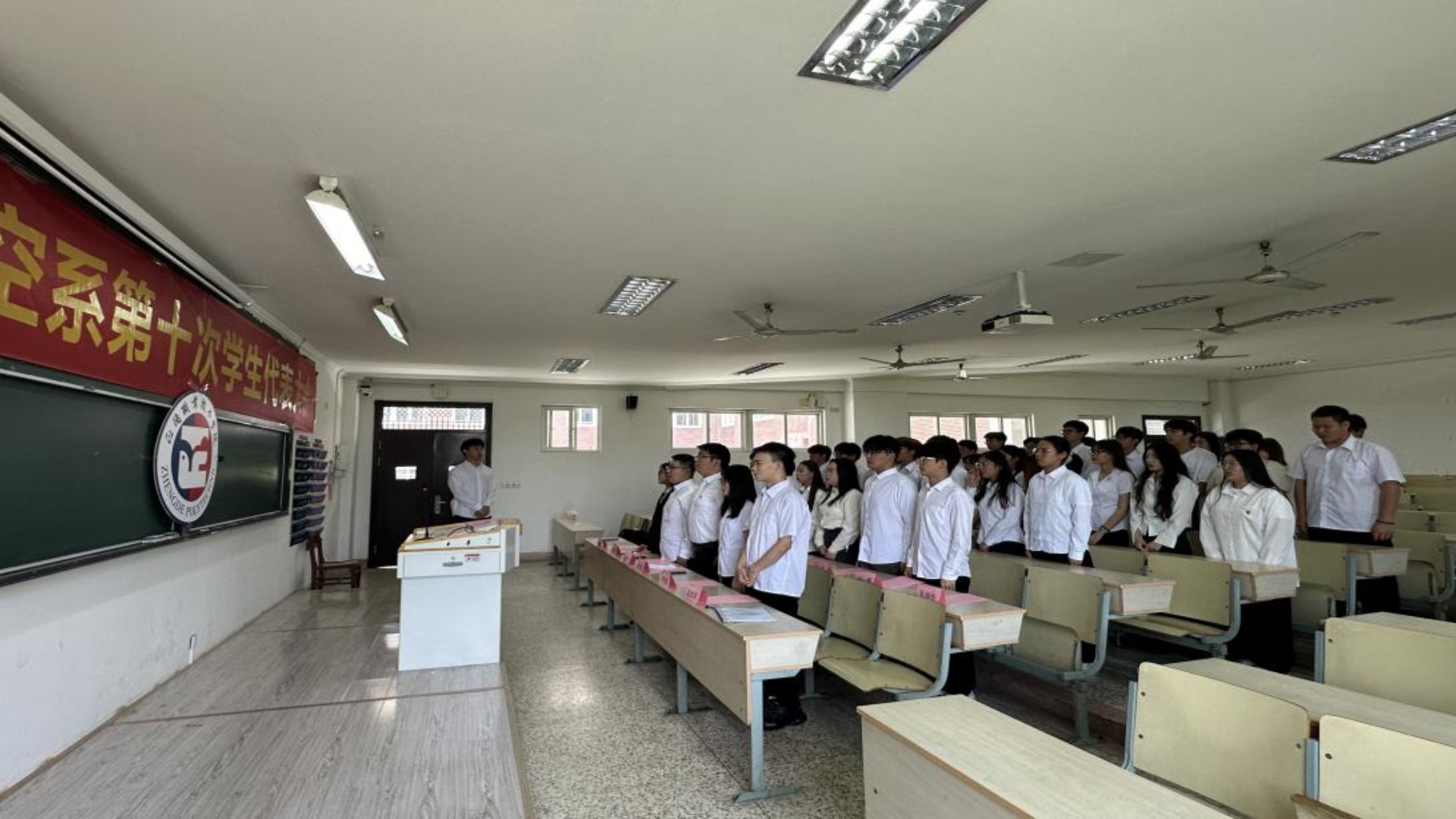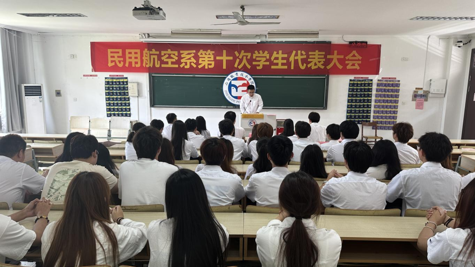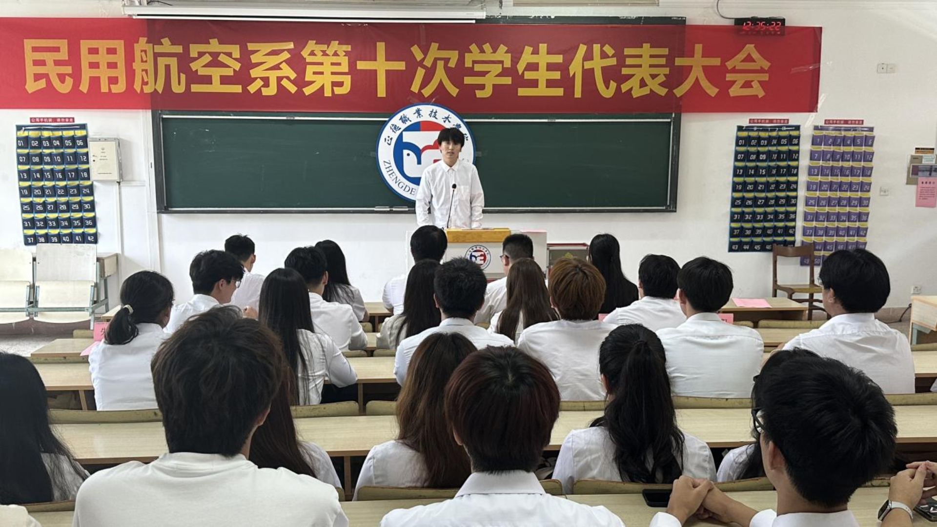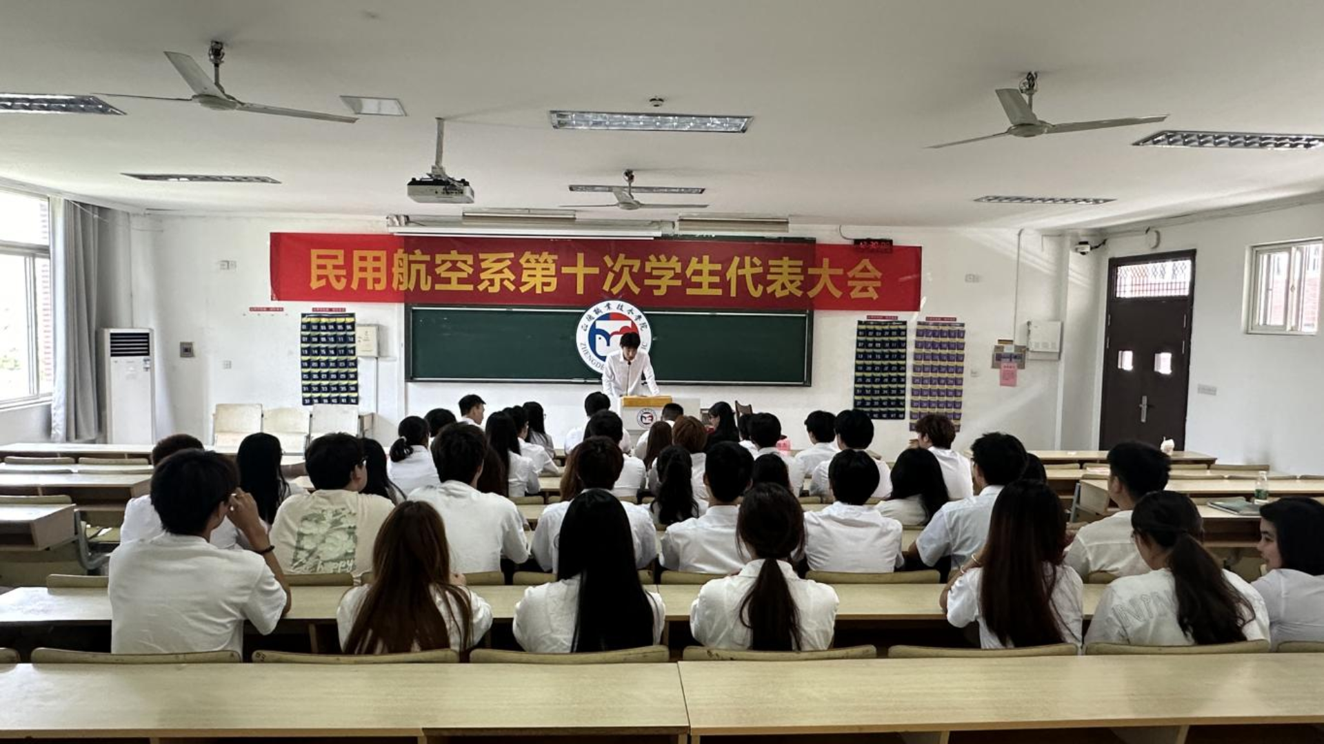 大会伊始,全场肃立,奏唱国歌。激昂的旋律在教室上空回荡,瞬间激发了每一位与会者的爱国之情。紧接着,电子与信息技术系执行主席贡泽阳上台致辞,他对民用航空系的学生们表达了诚挚的祝福,并希望未来双方能够加强交流与合作,共同为学院的发展贡献青春力量。