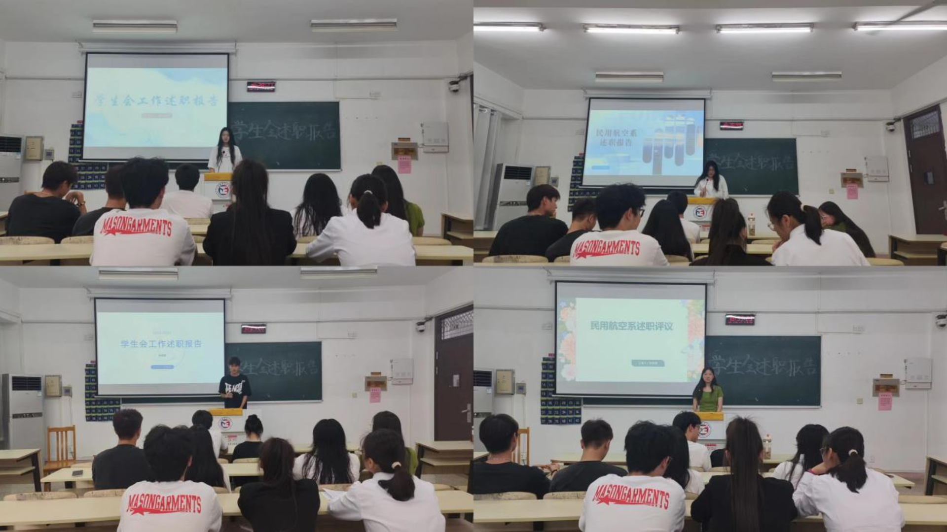 随后,学生干部娄鑫杨、陈思睿、朱晨、陈颖、黄瑞欣等9位同学对各部门的工作进行了总结和回顾,通过展示ppt的形式,展示过去一年的活动组织参与情况同时对未来的工作做出规划和展望。