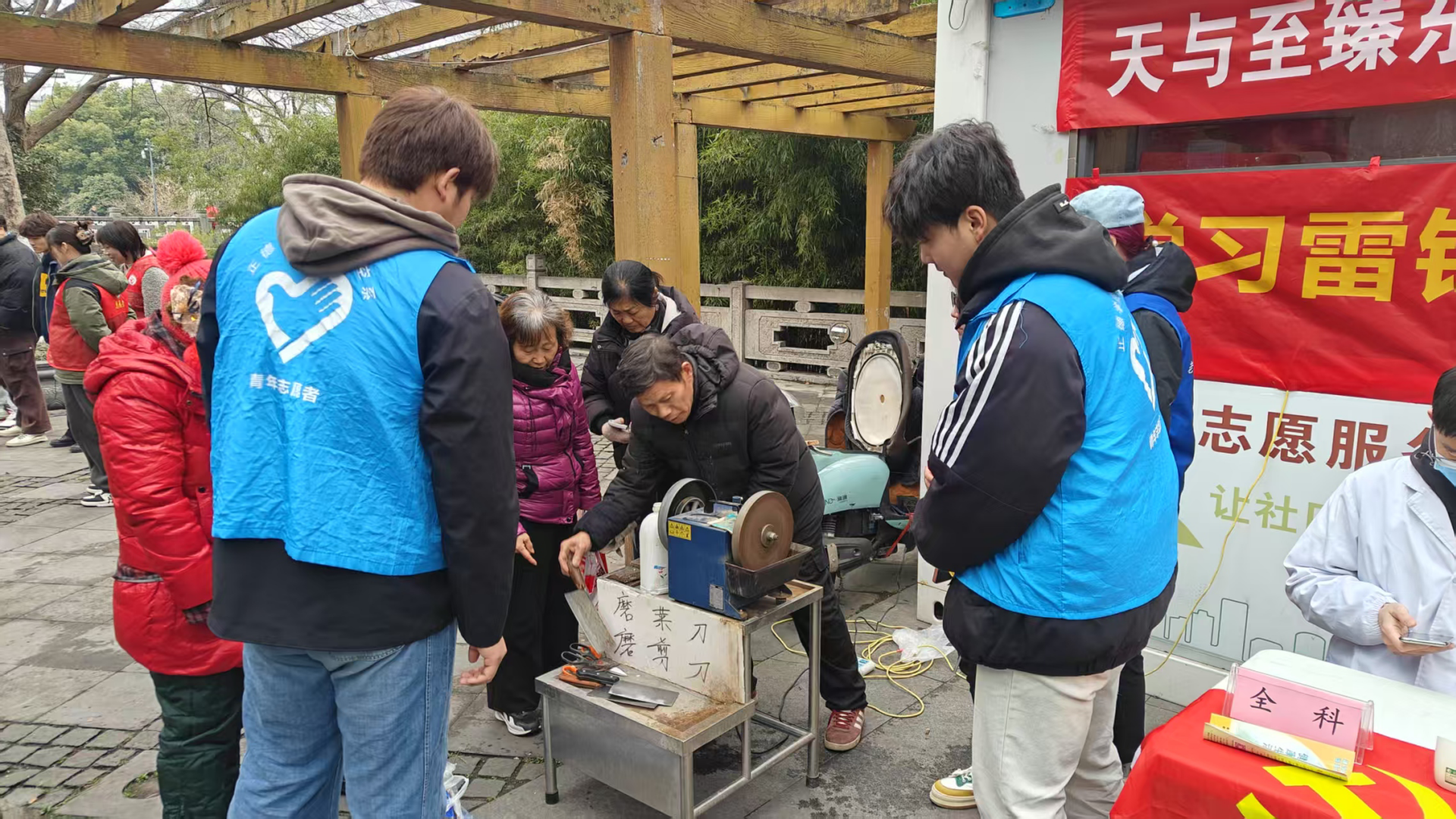 随后,同学们来到夫子庙东水关社区。活动现场设置多个特色展区,我系志愿者协助社区医护团队为居民免费量血压、提供健康咨询,免费磨刀等暖心项目。我系志愿者充分发挥创意,带领居民制作扭扭棒郁金香手工艺品,传递春日温暖。