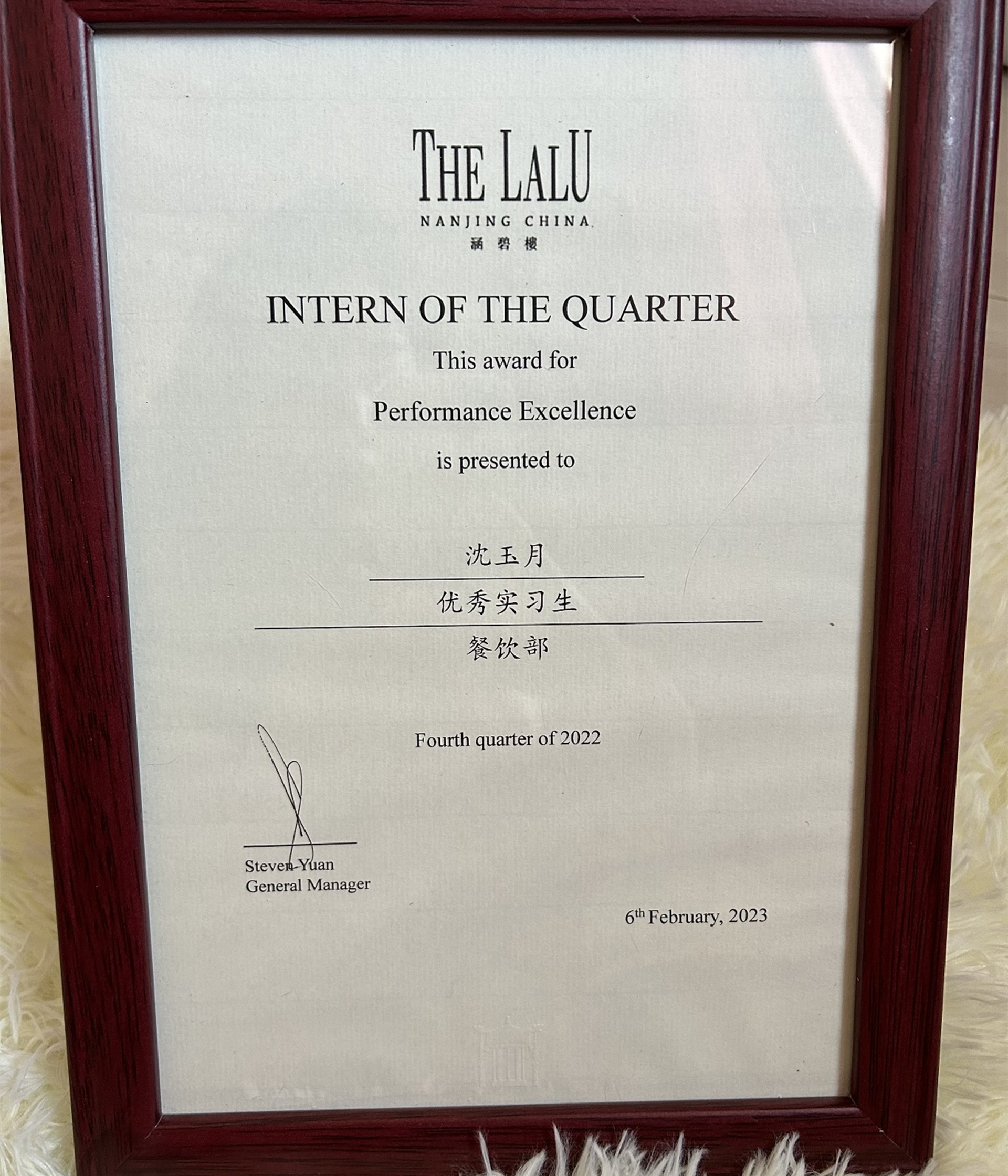 级学生。在实习期间,她认真按照工作岗位以及部门要求保质保量完成工作,服从上级部门要求保质保量完成工作。实习结束后,顺利被涵碧楼评为优秀实习生。