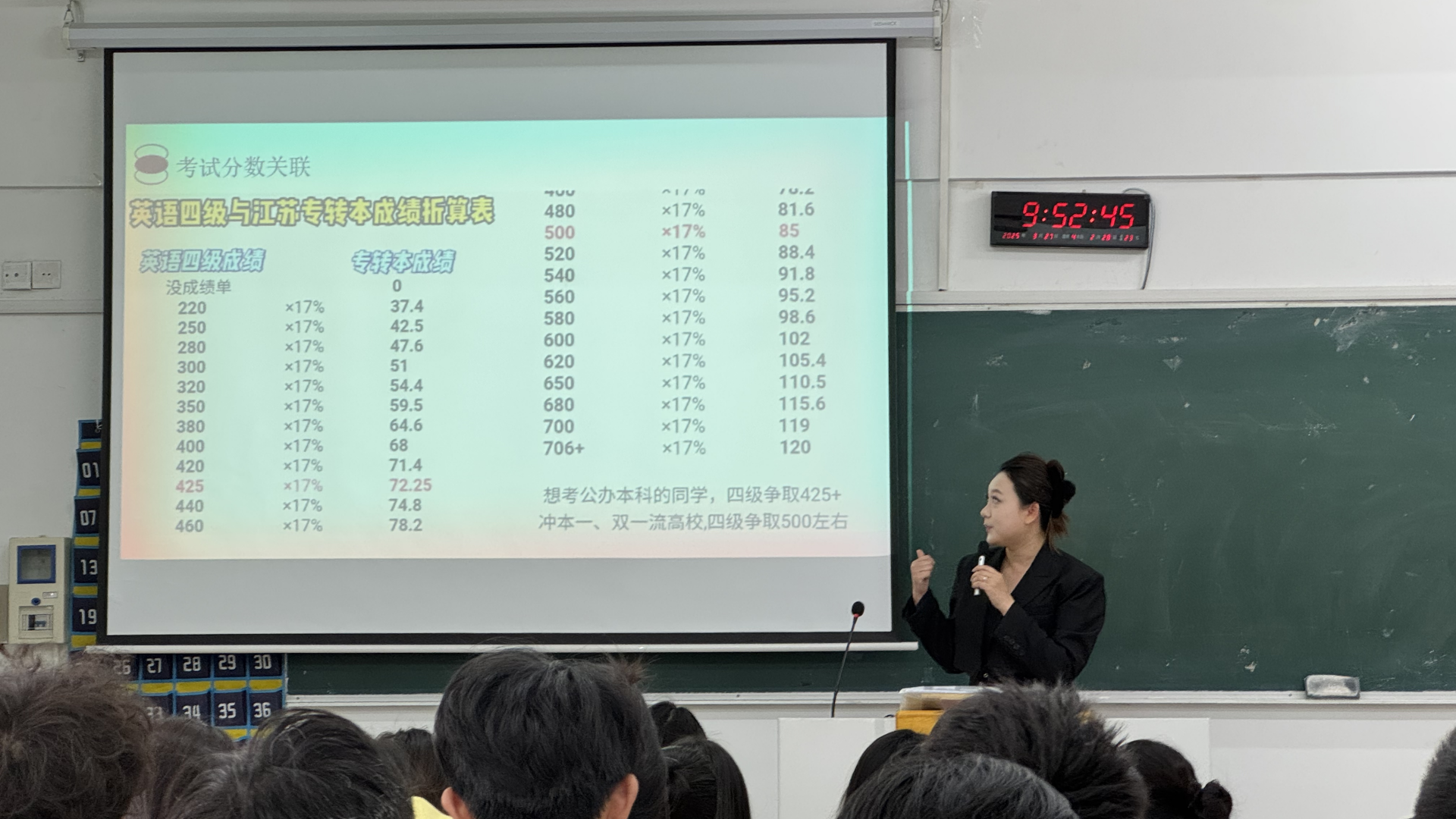 颜青老师首先详细介绍了四级考试的报名流程、考试时间节点及题型结构,重点剖析了听力、阅读和写作翻译三大模块的考查重点及分值分布。她结合历年真题,深入分析了四级考试与江苏省专转本英语科目在词汇、语法及阅读能力考查上的高度相似性,并强调:“根据江苏省教育考试院政策,四级成绩可按17%的比例折算为专转本英语科目成绩,建议同学们把握机会,争取高分。”