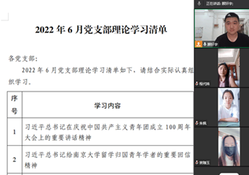 首先支部书记虞骏卿同志带领大家学习《习近平总书记在庆祝中国共产主义青年团成立100周年大会上的讲话》的重要精神。虞书记强调学习贯彻习近平总书记的重要讲话,要坚守理想信念、补足精神之钙,当前最重要的是,要坚定爬坡过坎的勇气、底气和信心;要投身改革攻坚、主动担当作为,用青春和汗水,不断奏响新时代的前进主旋律;要把学习当作信仰,不断提升能力和才干,切实担负起中国特色社会主义接班人的重任。“沧海横流,方显出英雄本色”。新时代是青年人实现价值、超越自我的时代,新时代是青年人建功立业、开创未来的时代。广大青年朋友要以习近平新时代中国特色社会主义思想为指引,坚定理想、主动担当、增长才干,以自强不息的精神、朝气蓬勃的姿态,奋力谱写中华民族伟大复兴进程中激昂的青春乐章。
