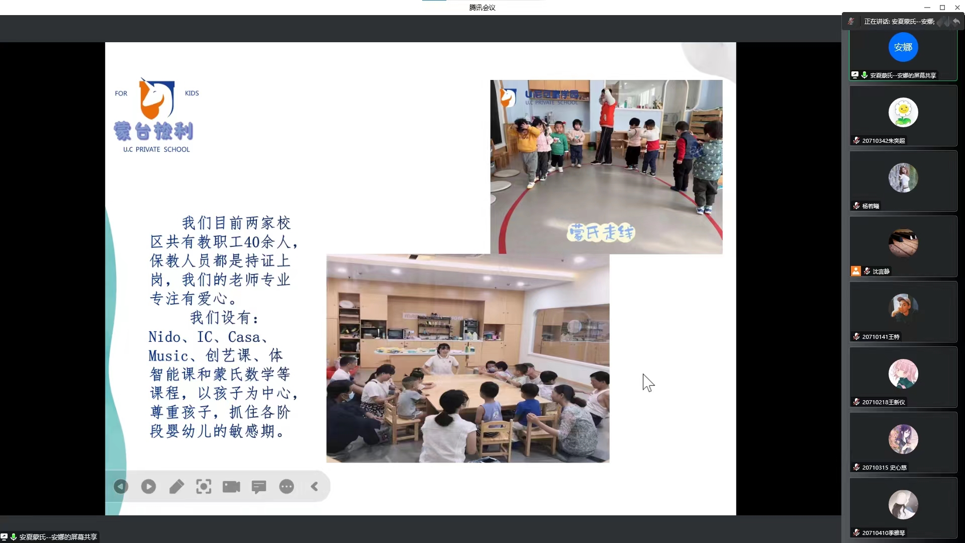 公司HR安娜老师通过腾讯会议介绍了企业概况、公司所在园区的环境、蒙氏教育理念、岗位需求、工资待遇和员工培养计划以及公司未来发展前景等几个方面。该公司以完备的蒙氏环境,秉持“激起生命无限探索欲,感知幸福的能力,趋向独立和智慧的生命,以尊重孩子,抓住各阶段婴幼儿的敏感期,了解自己最终成为自己”的教育理念,深深的吸引了同学们。他们认真听讲、积极参与互动,不明白的现场提问。安娜老师一一解答同学们的疑问,并真诚邀请志同道合的同学来蒙氏实现自己人生价值。