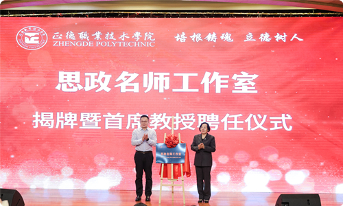 江爱华、任慈为“高职课程思政教学研究中心”揭牌,孙雷为“思政名师工作室”揭牌并为苗秀娟教授颁发首席教授聘书。