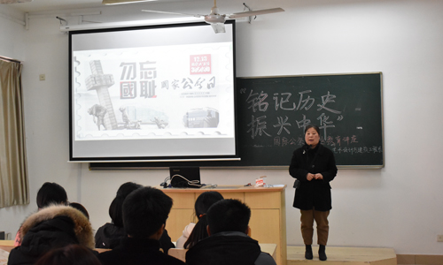 首先由谢岚主任表明了本次讲座的目的:“勿忘国耻、铭记历史”。谢岚主任讲述了打破日本三个月灭亡中国的重大战役—淞沪会战。接着由淞沪会战引出了在南京保卫战中英勇牺牲的抗日英烈—萧山令,萧山令先生为救国,决定投笔从戎。由此,谢岚主任教导学生要勿忘历史,吾辈自强,珍爱和平、开创未来的坚定立场。