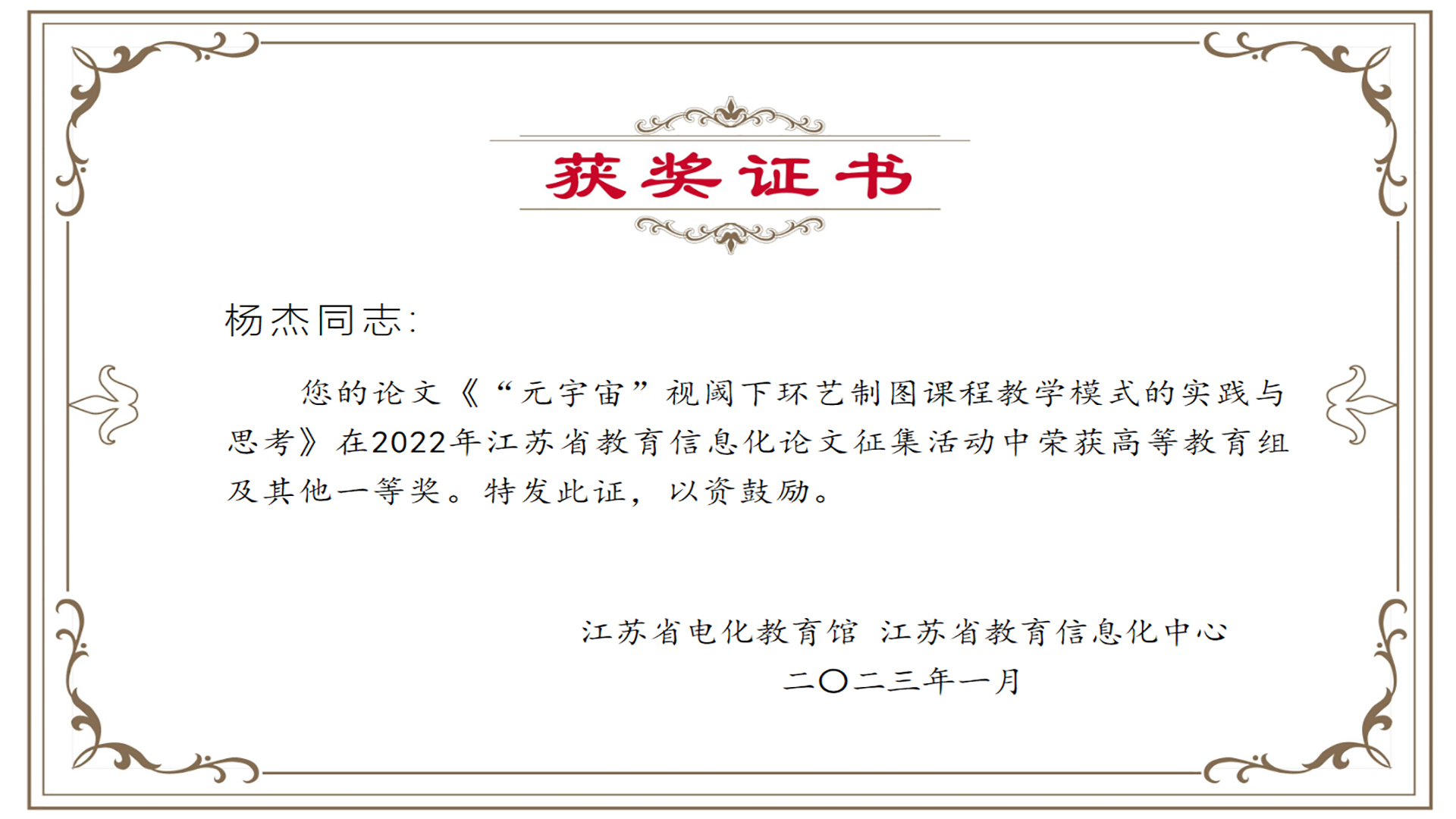 近日,2022年度全国教育技术论文活动公布比赛结果,黄色直播 艺术设计与建筑工程系杨杰老师的论文《“元宇宙”视阈下环艺制图课程教学模式的实践与思考》荣获“创新论文”。