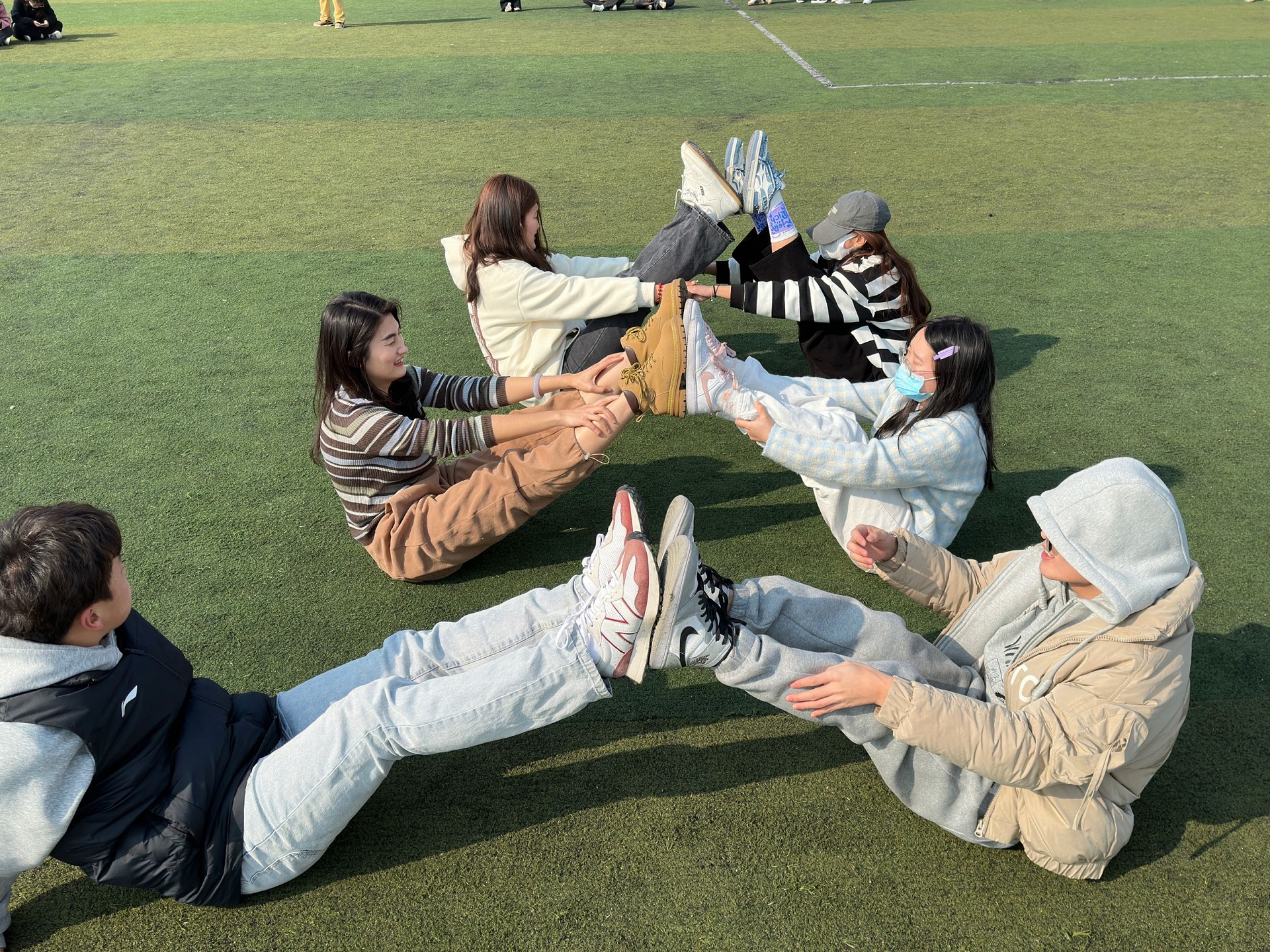 全专业76名同学换上彩色的运动服,跟着辅导员一起,走进操场,共同开展瑜伽练习,享受春风的同时,拉伸筋骨。大家或围成圈,或抱成团,或手拉手,或组成小队,动作虽然达不到那么标准,但是每个人脸上都洋溢着笑容,感受着身体舒展,互相配合完成动作的喜悦。整个班级和辅导员融在一起,互助互动,氛围特别好。