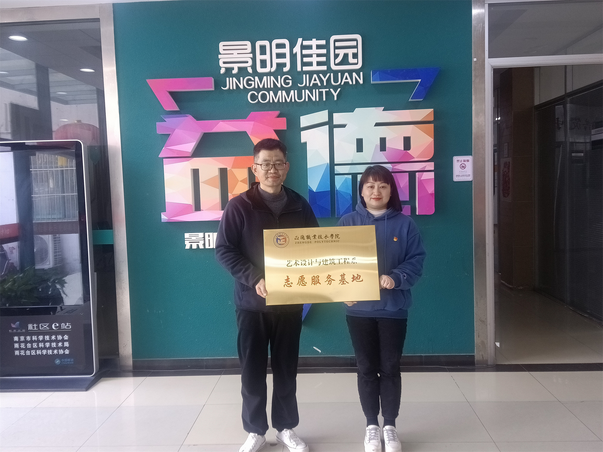 随后,周卫与刘思思共同为“大学生社会实践基地”揭牌,挂牌仪式在热烈的掌声中圆满结束。挂牌仪式结束后,参会领导与系部实践部分团队师生代表进行了热烈的座谈交流,就之后的志愿实践共建活动展开初步的规划。艺术设计与建筑工程系与铁心桥街道景明佳园社区合作共建的“大学生社会实践基地”,是青年大学生实践理论知识、培养奉献精神、增强服务意识、了解社会和认识国情的重要载体,开拓了学院志愿服务工作新平台,对提高大学生志愿服务能力与综合素质发挥重要作用。是大学生走进社区,服务社会,丰富经验,培养能力的重要阵地。