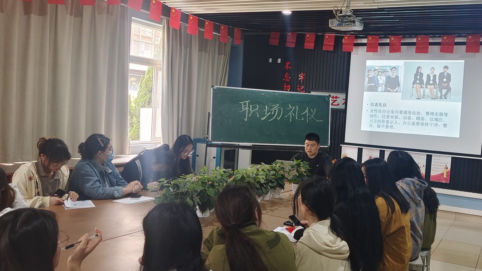 为增强学校学生对职场礼仪的认识,掌握更多的礼仪知识,同时提升大学生就业能力,为以后能顺利面试打下坚实基础。4月24日中午13:00在8204教室开展“职场礼仪”专题指导讲座,由闵济舜老师主讲。