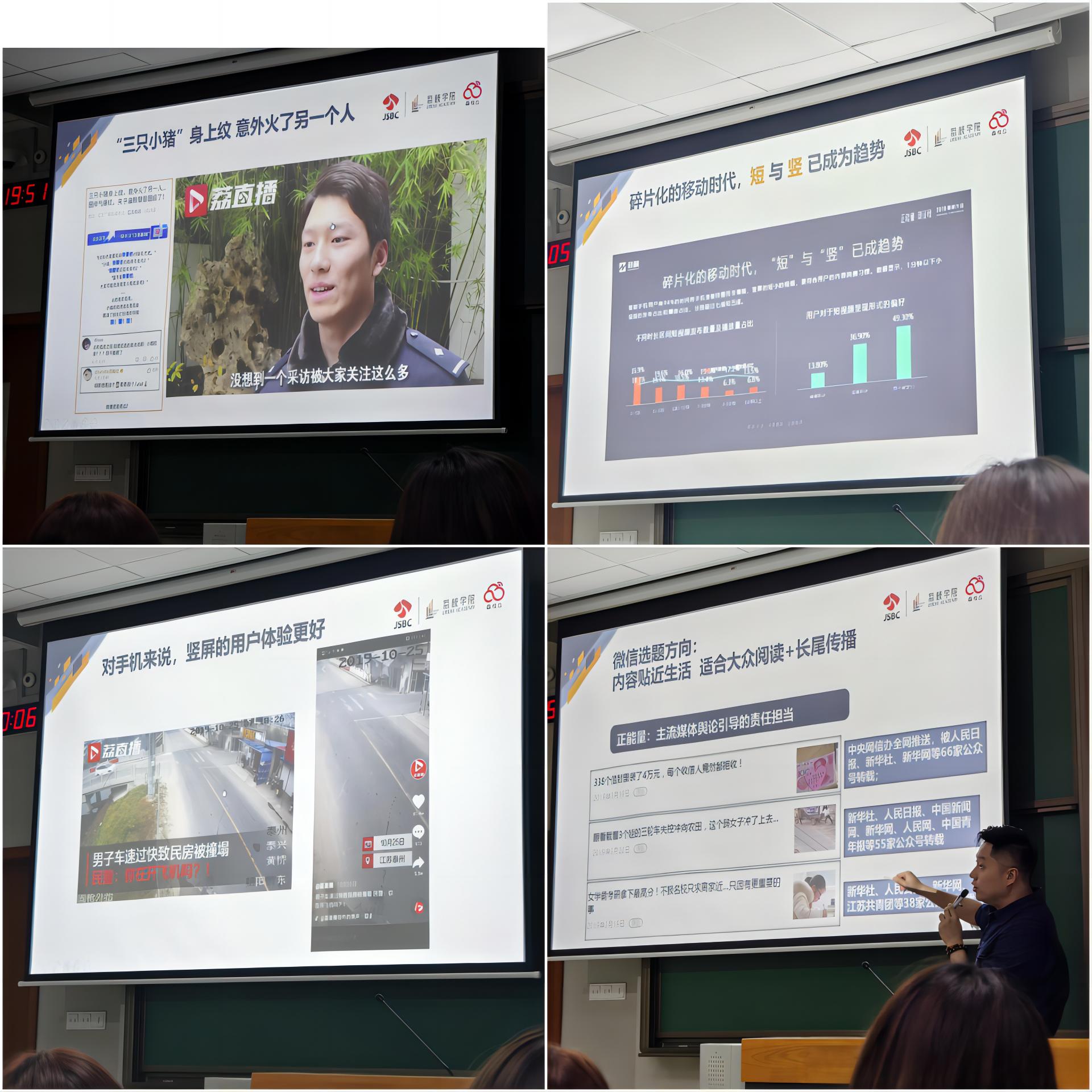 本次精彩讲座深入剖析了微博、微信公众号和抖音短视频等新媒体平台的制作核心技巧,结合生动的实例,通过图文并茂、视频辅助的多元形式,让学生在新媒体繁荣的时代背景下,更加从容地应对各种挑战。王老师特别强调了微信文章传播中的关键印象因素,并详细解析了如何巧妙运用短视频等流行媒介,进一步提升同学们的新媒体应用技能。同时,王老师还着重指出了作为新闻工作者应具备的素养,激励大家在新媒体时代坚守原则,勇于创新。整场讲座在积极向上的氛围中圆满落幕。