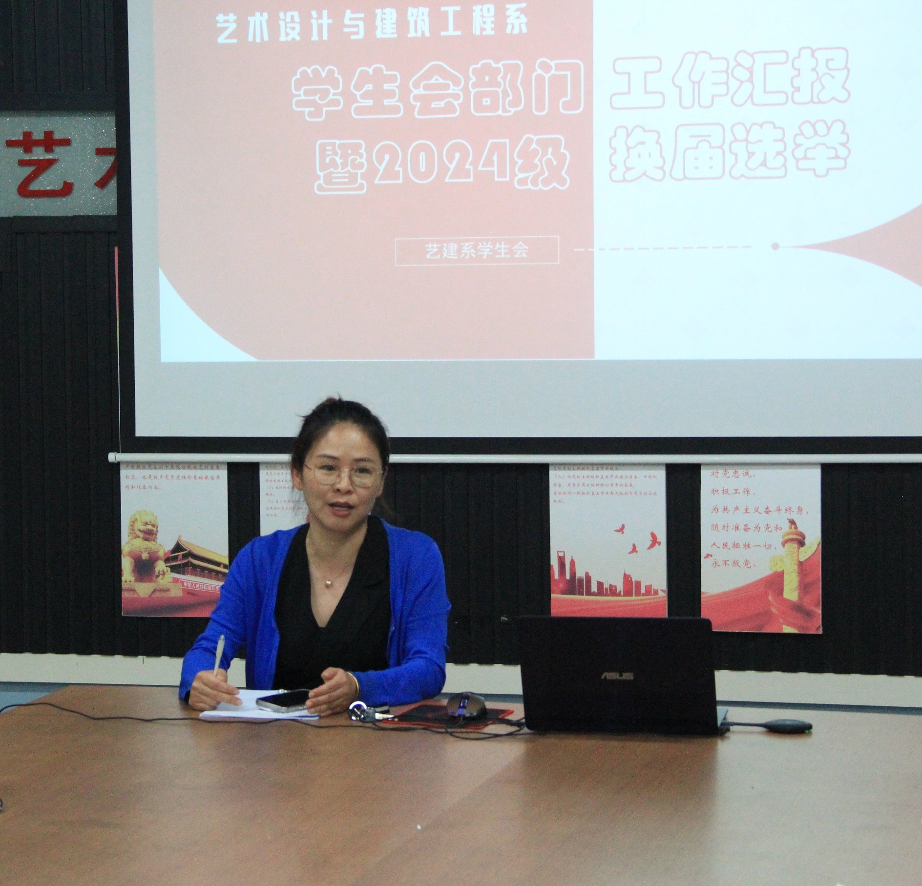 接着,党支部书记杨春娟作总结发言。她首先感谢了同学们的辛苦付出,对学生会近期的工作成果给予了肯定,并激励同学们要继续强化责任意识,起好带头作用,促进自我提升,加强学生会内部建设,打造系部品牌,为艺术设计与建筑工程系发展贡献力量。