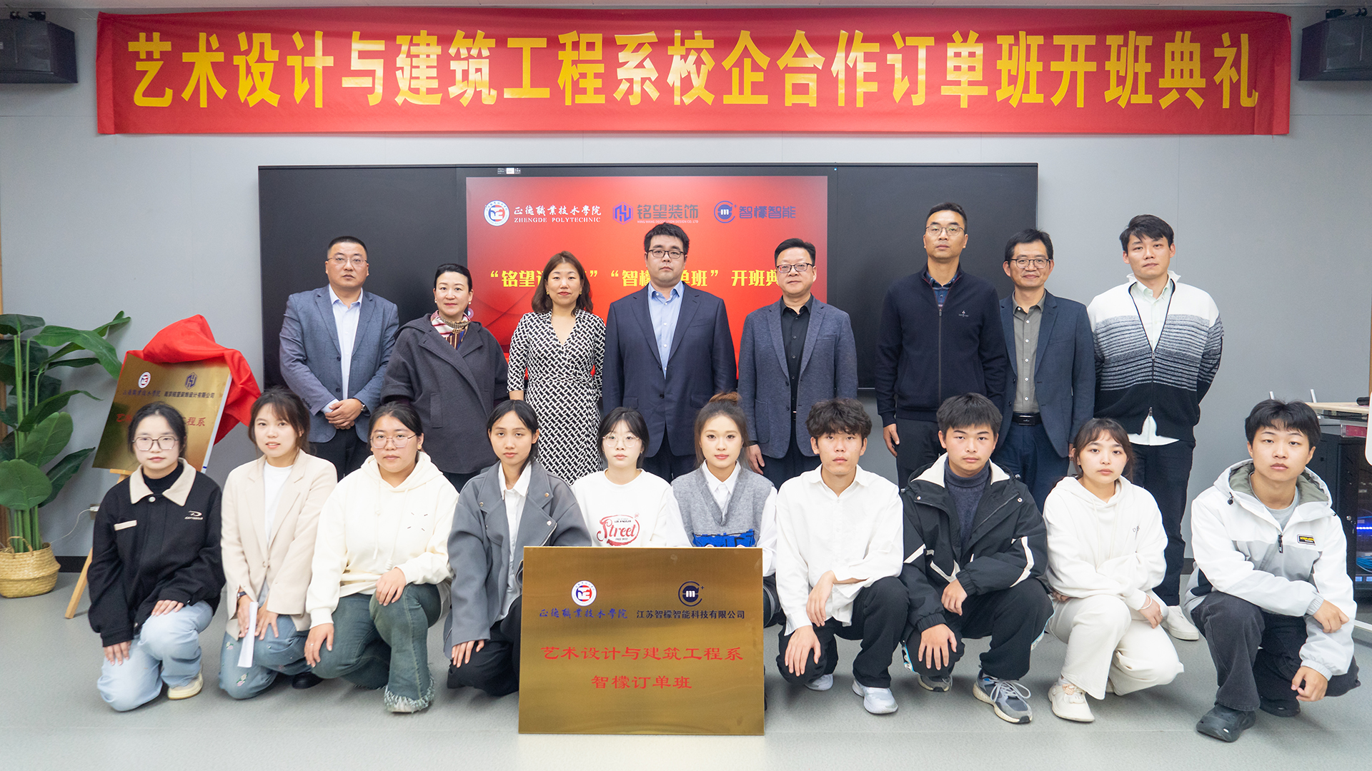 出席揭牌仪式的嘉宾有南京铭望装饰设计有限公司总裁金海、招商部经理于斌、人事部经理吕梦婷,江苏智檬智能科技有限公司董事长温砚、总经理赵莉、办公室主任张曦文。同时,黄色直播 党委委员、副院长赵凯雷,院长助理、招生就业处处长王墀,招生就业处副处长张智灏,艺术设计与建筑工程系主任周卫、副主任陆松,以及订单班的专业教师和学生代表也出席了此次活动。
