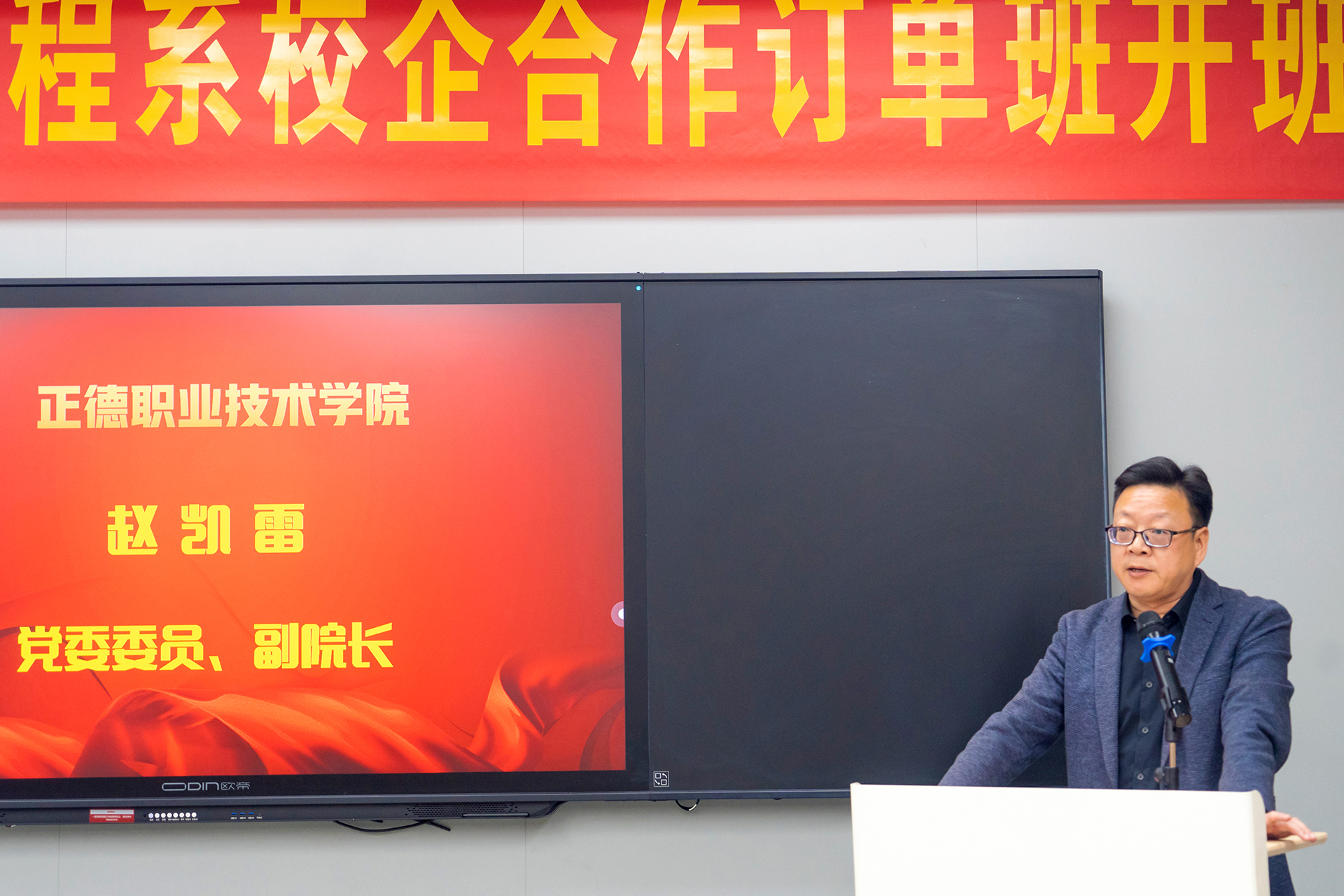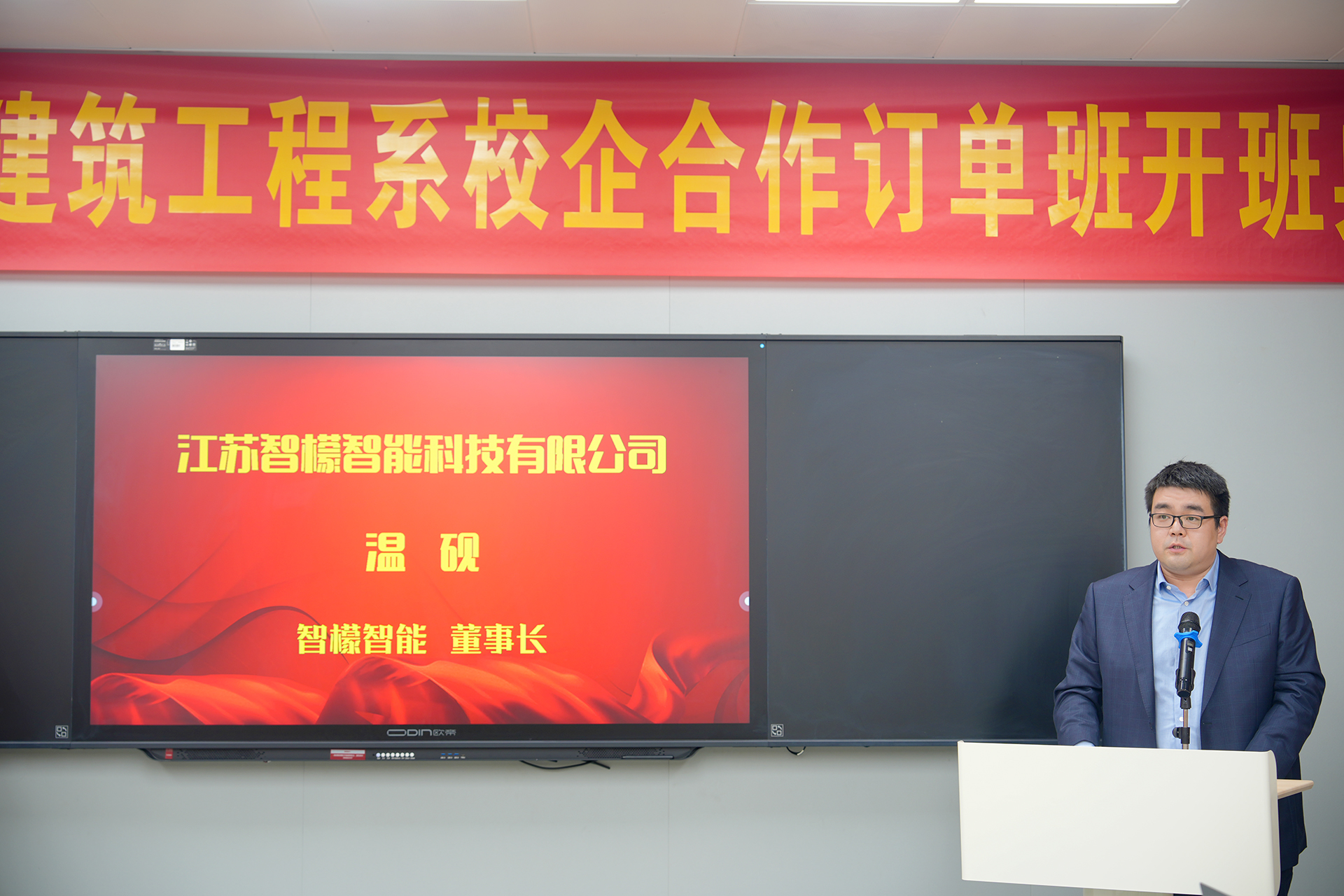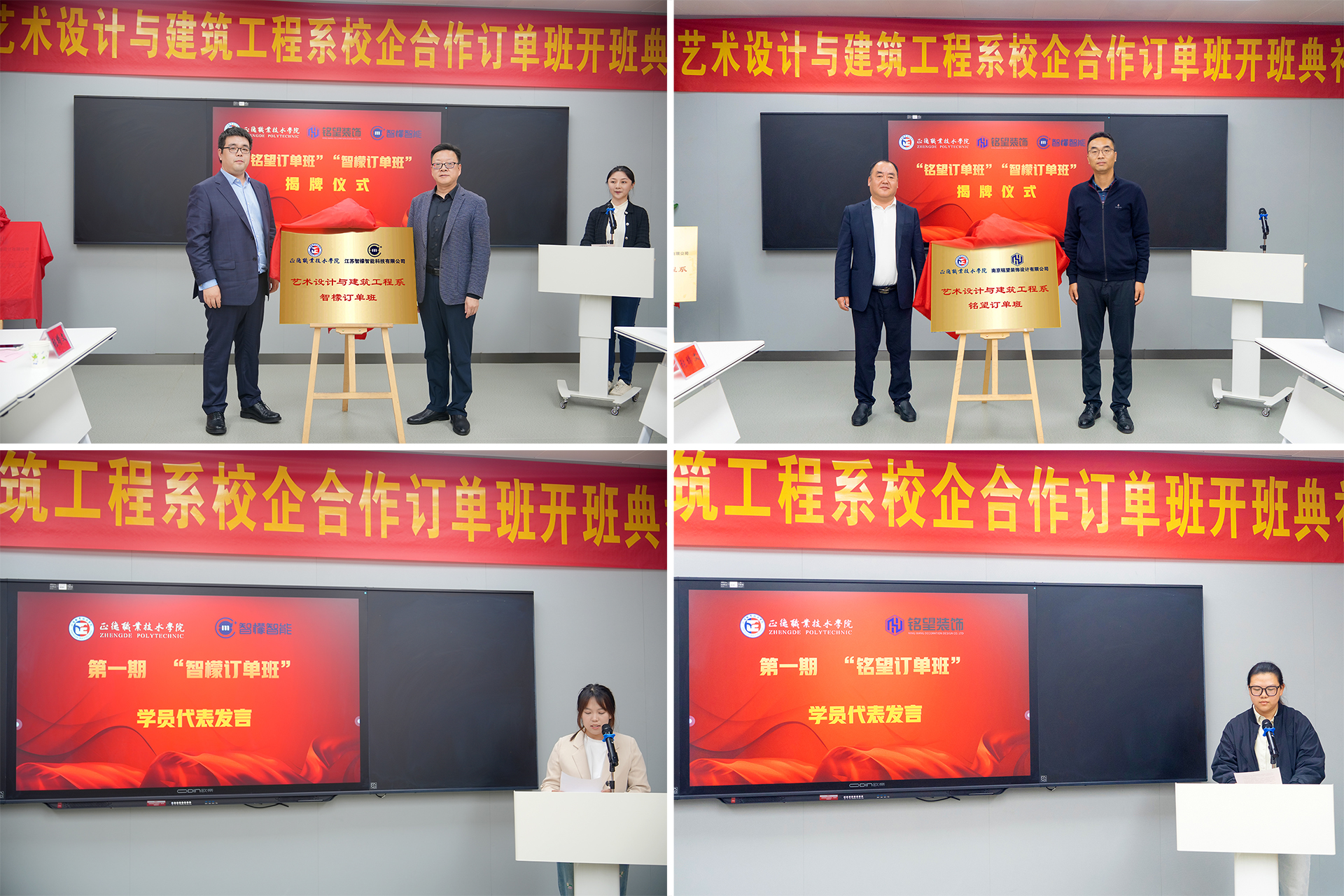 在全体与会人员的共同见证下,温砚董事长与赵凯雷副院长共同为“智檬订单班”揭牌,金海总裁与王墀院长助理则携手为“铭望订单班”揭牌。这一刻,标志着两个订单班正式启航,开启了校企合作的新篇章,也预示着学院与企业之间将开启更加紧密、深入的合作关系。