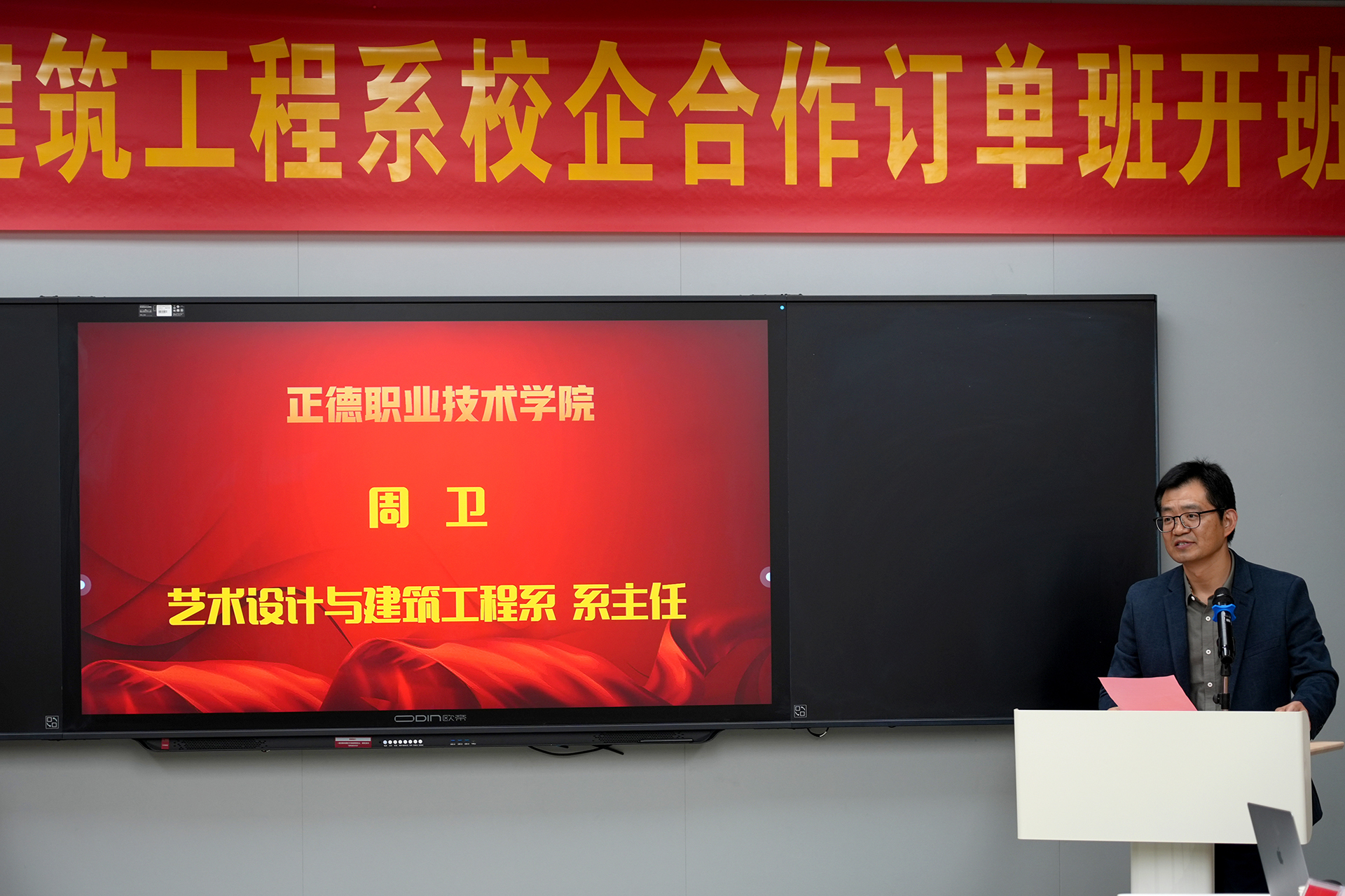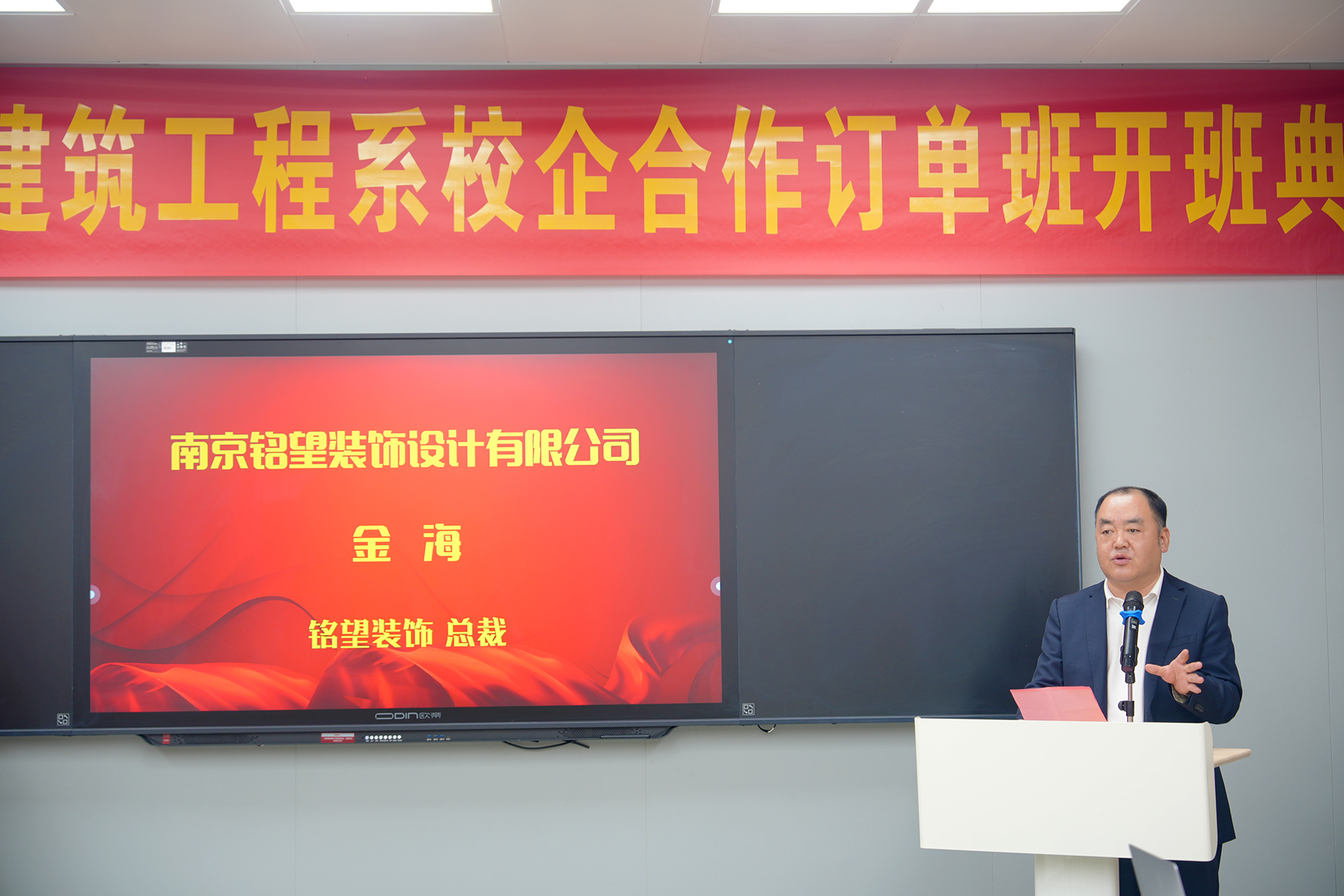 仪式伊始,与会人员共同观看了南京铭望装饰有限公司和江苏智檬智能科技有限公司的企业宣传片,深入了解了这两家公司在装饰设计、智能科技领域的卓越成就和发展愿景。随后,艺术设计与建筑工程系主任周卫上台致辞,对两家公司长期以来对学院人才培养工作的鼎力支持表示衷心感谢,并期待未来双方能在更多领域开展深度合作,共同提升人才培养质量。