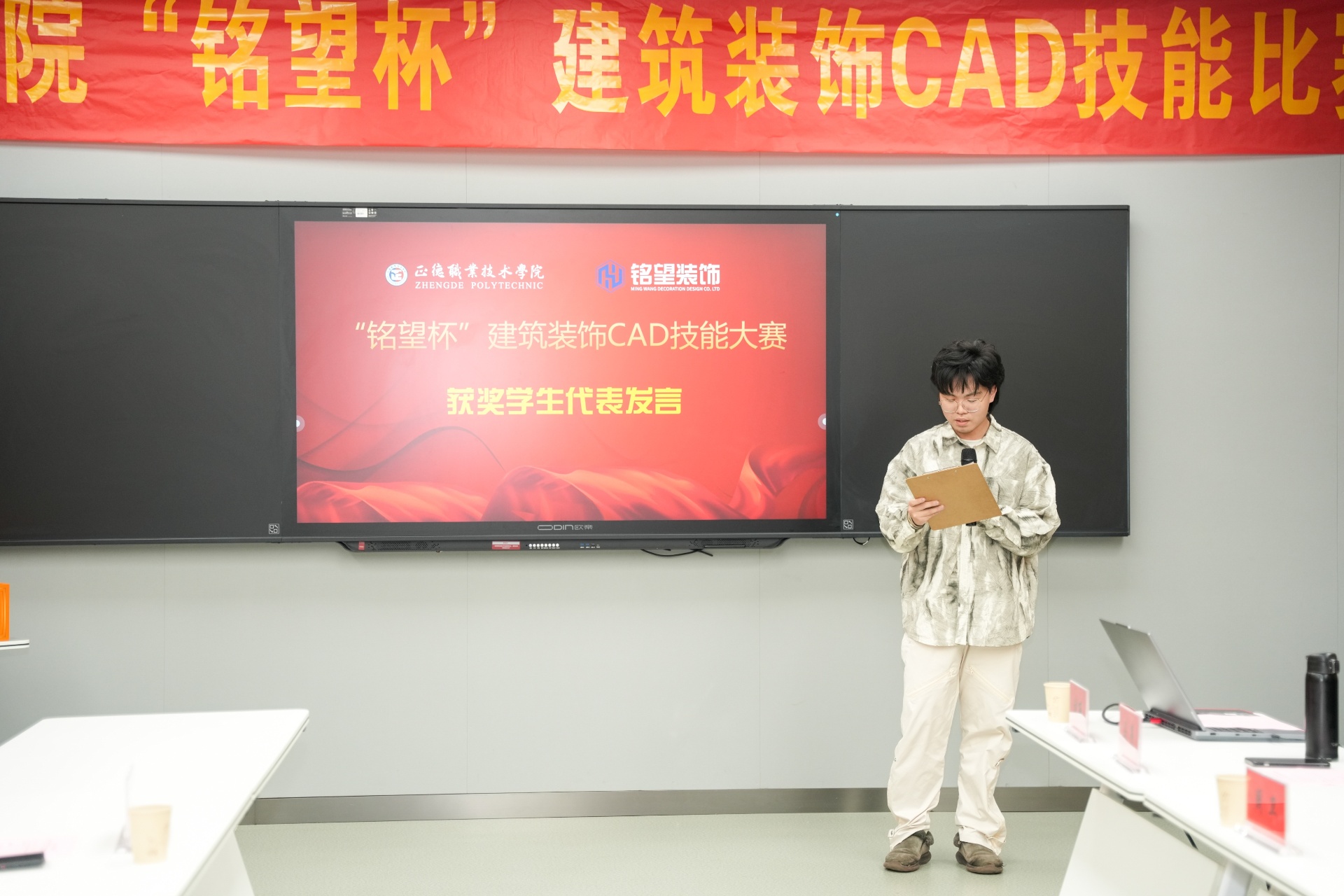 作为获奖学生代表,2023级建筑室内设计专业的李成翰同学发表了感言。他表示,通过参加本次大赛,不仅锻炼了自己的实践操作能力,还深刻体会到了团队合作的重要性。他承诺,在未来的求学道路上,将更加严格要求自己,不断提升自己的专业技能和综合素质,为未来的职业生涯打下坚实的基础。