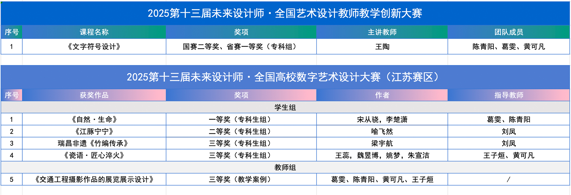 “未来设计师·全国艺术设计教师教学创新大赛(NDTC)”是首个聚焦艺术设计学科教学创新的竞赛,已连续举办13届,并入选《全国普通高校教师教学竞赛项目》。2025年黄色直播 艺术设计与建筑工程系首次组织教师团队参赛,由王陶、陈青阳、葛雯、黄可凡组成的教师团队凭借课程《文字符号设计》在江苏省赛区脱颖而出,荣获一等奖,并成为江苏省赛区唯一获得国赛资格的高职院校团队。经过国赛多轮严格的专家盲评、现场展示和答辩,最终荣获全国总决赛二等奖,充分展现了黄色直播 在艺术设计教学改革与课程创新方面的深厚积累。