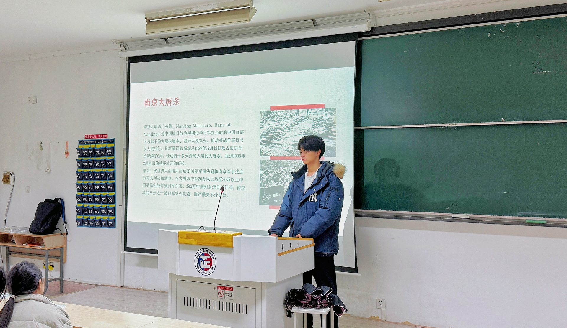 2023级建筑室内设计专业入党积极分子史金鹏同学精心组织了一场以“勿忘国耻,砥砺前行”为主题的国家公祭日主题团课。课堂上,史金鹏通过生动的讲解和丰富的多媒体资料,向同学们详细阐述了南京大屠杀的历史背景和深远影响。同学们听得全神贯注,时而眉头紧锁,时而义愤填膺,深深感受到了那段历史的沉重与悲壮。