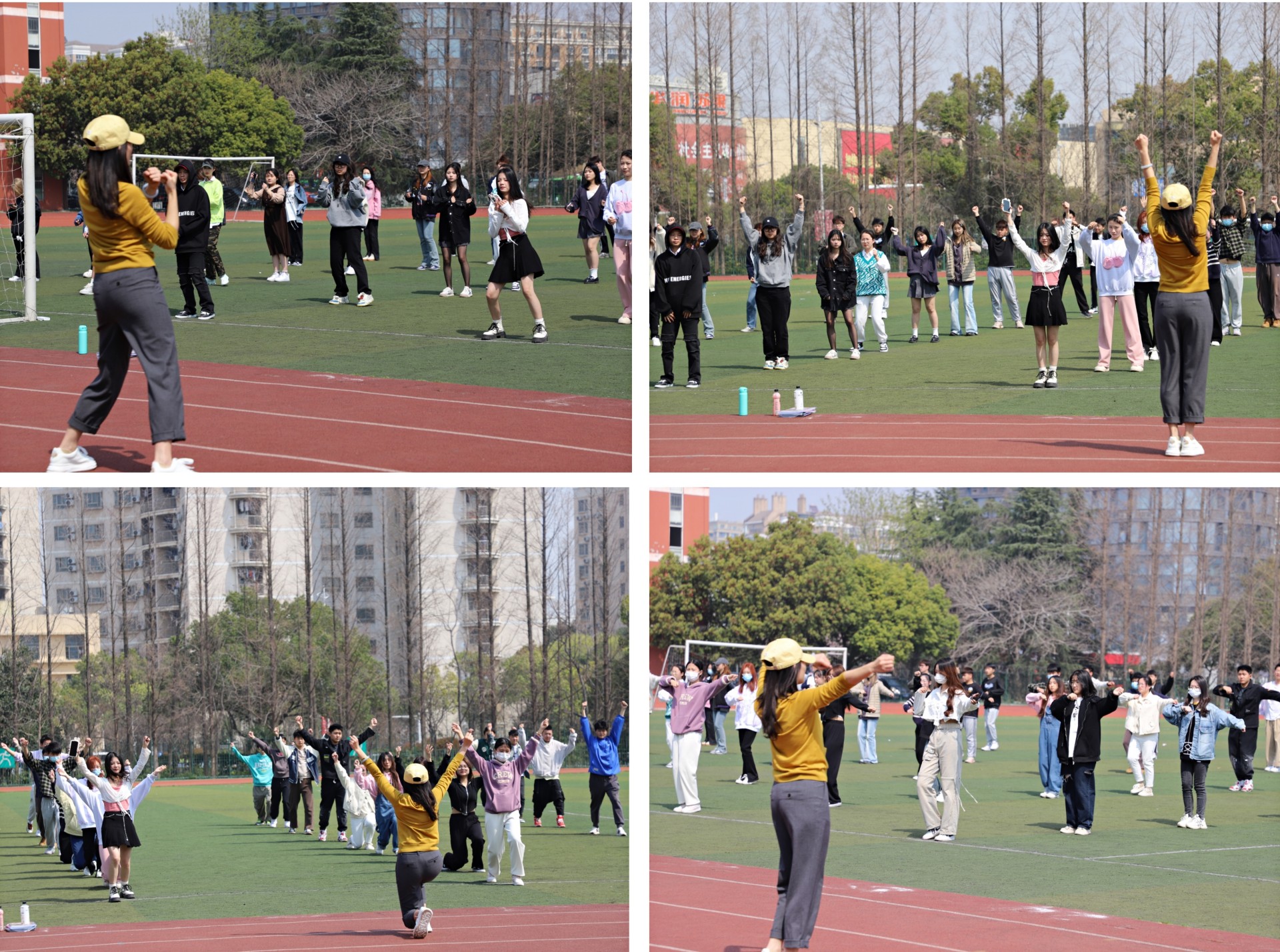 全系100名同学换上彩色的运动服,跟着辅导员一起,走进操场,共同开展啦啦操练习,享受春风的同时,拉伸筋骨。大家或围成圈,或抱成团,或手拉手,或组成小队,动作虽然达不到那么标准,但是每个人脸上都洋溢着笑容,感受着身体舒展,互相配合完成动作的喜悦。整个集体和辅导员融在一起,互助互动,氛围特别好。