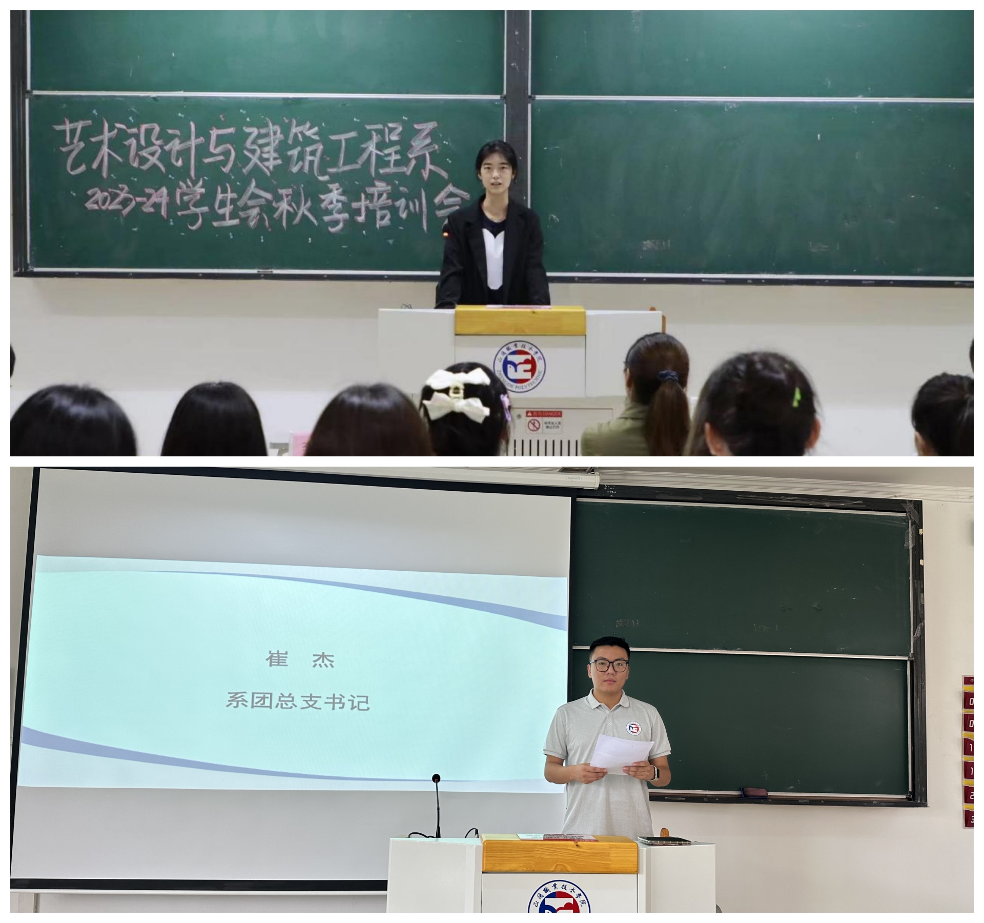 学期伊始,万象更新。为了进一步提高艺术设计与建筑工程系学生干部的整体素质,加强学生队伍的凝聚力,强化学生干部的自律意识,提高工作效率,保证工作的连续性,使学生干部能更好地服务学院、服务同学,有效开展工作。2023年9月26日晚上,艺术设计与建筑工程系在1202阶梯教室召开了学生干部培训会,本次会议由学生会外联部部长庄宝佳主持,系党支部书记杨春娟、团总支书记崔杰参加本次活动。