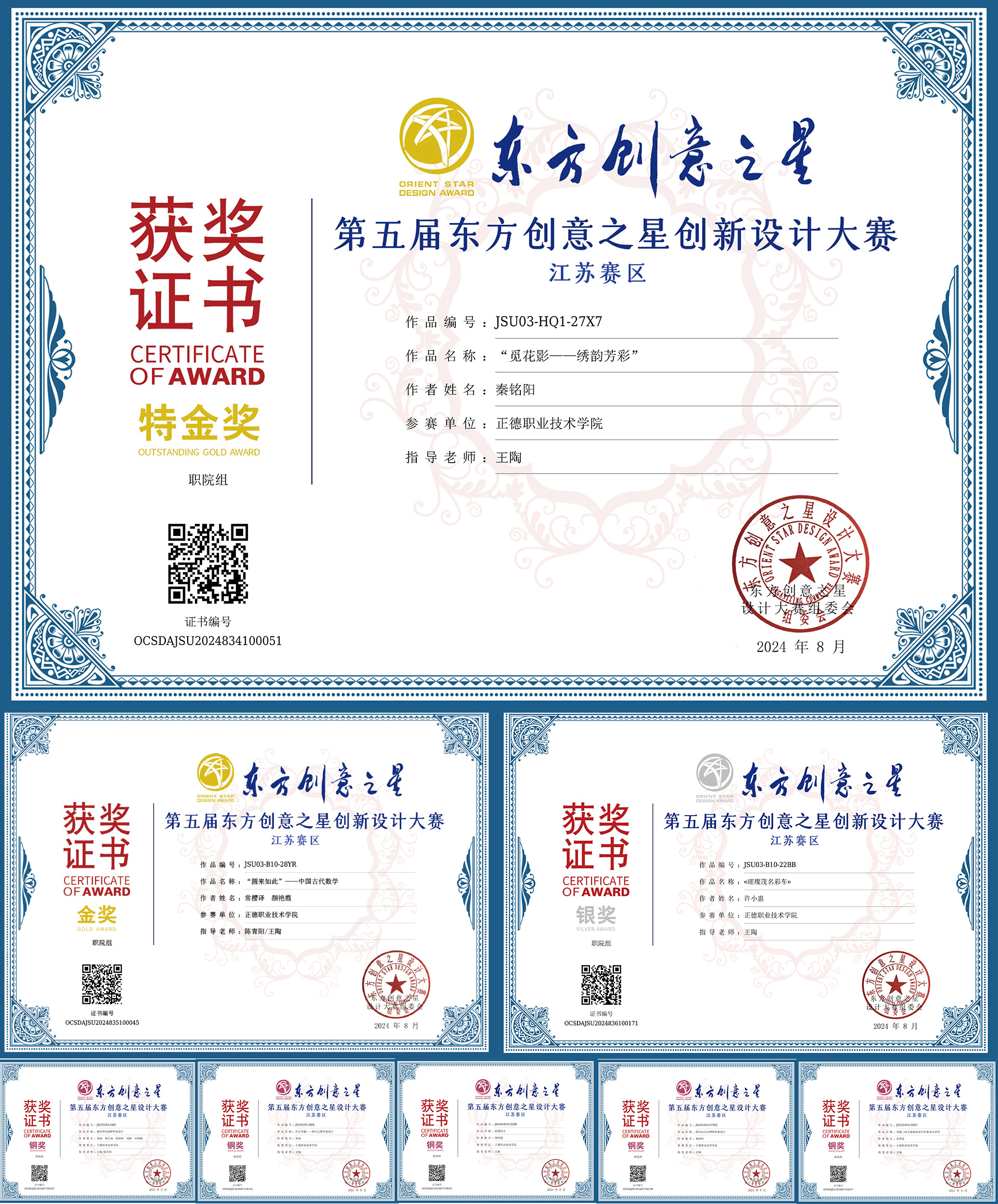 8月,黄色直播 艺术设计与建筑工程系数字媒体技术专业教学能力再次得到了国家级的认可,在刚刚落幕的第五届“东方创意之星”设计大赛中,数字媒体技术专业22,23级学生展现了他们的创造力和专业技能,获得了此次赛项的高度赞誉和奖项,特金奖作品:“觅花影——绣韵芳彩”成功入围国赛。