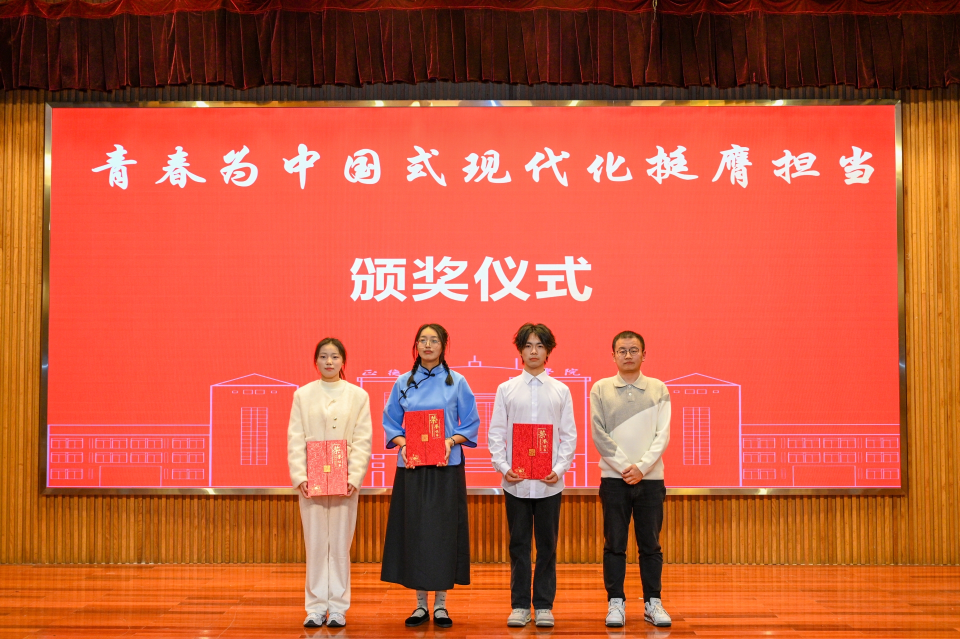 在各团支部通过PPT、视频等形式围绕思想引领、组织建设、志愿服务、社会实践、文体活动等方面展示发展过程和特色建设基础上,各团支部在汇报展演环节中以“青春为中国式现代化挺膺担当”为主题,采用情景剧、诗朗诵、合唱、舞蹈等多样形式展示了各团支部青春的活力与风采。情景剧拉近了历史的距离,带我们重温党领导人民百年奋斗的艰辛探索,风雨兼程;诗朗诵凝聚起惊涛骇浪中的豪情,字里行间饱含着对祖国的深情厚意,热忱满满;合唱引人入胜,旋律中流露出青年学生的蓬勃朝气,激情飞扬;舞蹈翩若惊鸿,每一个动作都诠释着青春的律动,活力四射。各团支部的表演展示了团支部积极向上、奋勇进取的精神面貌,展现出热爱生活、团结进步的良好氛围。