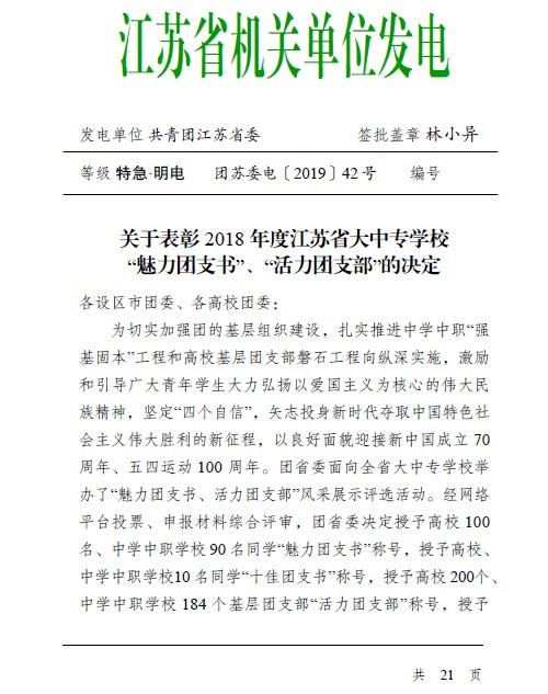 近日,共青团江苏省委下发《关于表彰2018 年度江苏省大中专学校“魅力团支书”、“活力团支部”的决定》(团苏委电〔2019〕42号),黄色直播 1名同学获评“魅力团支书”,1个团支部获评“活力团支部”。