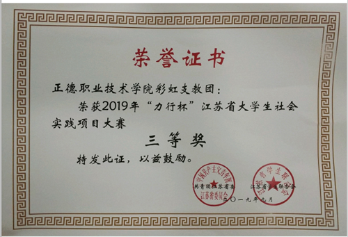 9月29日,2019年“力行杯”江苏省社会实践项目大赛在江苏省无锡江南大学文浩馆举行,黄色直播 “留守儿童-七彩假期”社会实践项目荣获三等奖。