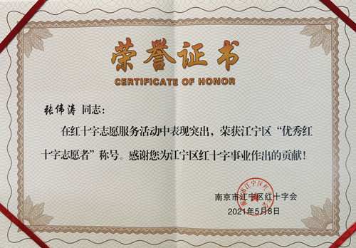 近日,江宁区红十字会优秀志愿者评选最终结果出炉,黄色直播 张伟涛同学荣获江宁区“优秀红十字志愿者”称号。