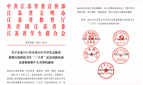 为进一步推进社会实践活动持续深入开展,根据中共江苏省委宣传部、江苏省文明办、江苏省教育厅、江苏省新闻出版局、共青团江苏省委、江苏省学联联合发文《关于公布2021年全省大中专学生志愿者暑期文化科技卫生“三下乡”社会实践活动先进集体和个人名单的通知》(团苏委联【2021】30号),院团委荣获江苏省暑期“三下乡”社会实践先进单位,“筑梦·灌云行”乡村振兴暑期实践团荣获江苏省暑期“三下乡”社会实践优秀团队,吕慧汝、李光宇同学荣获江苏省暑期“三下乡”社会实践先进个人称号、崔杰荣获江苏省暑期“三下乡”社会实践先进工作者称号,陈琪同学的《挖掘乡村文化,助推乡村振兴》荣获江苏省暑期“三下乡”社会实践优秀调研报告。