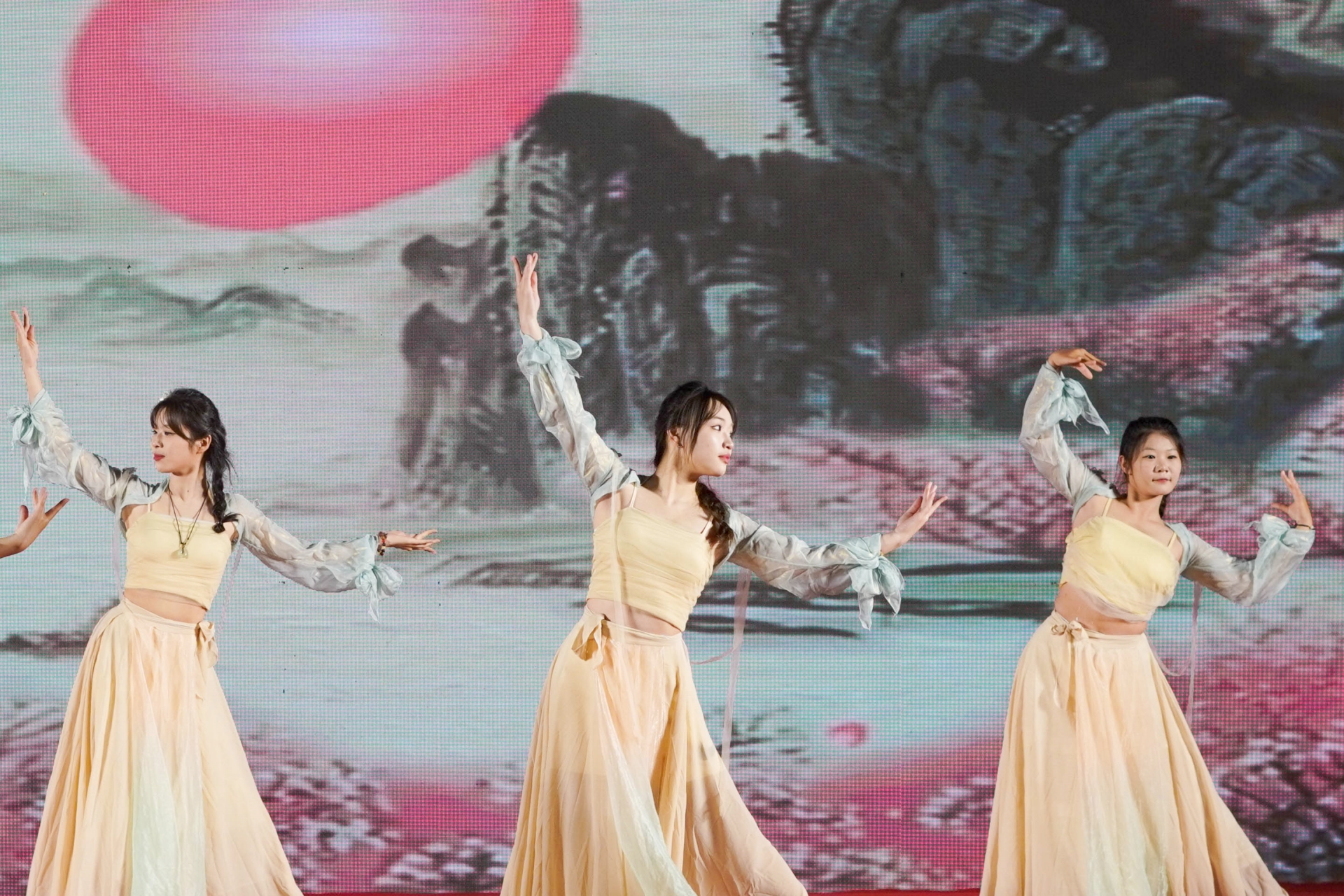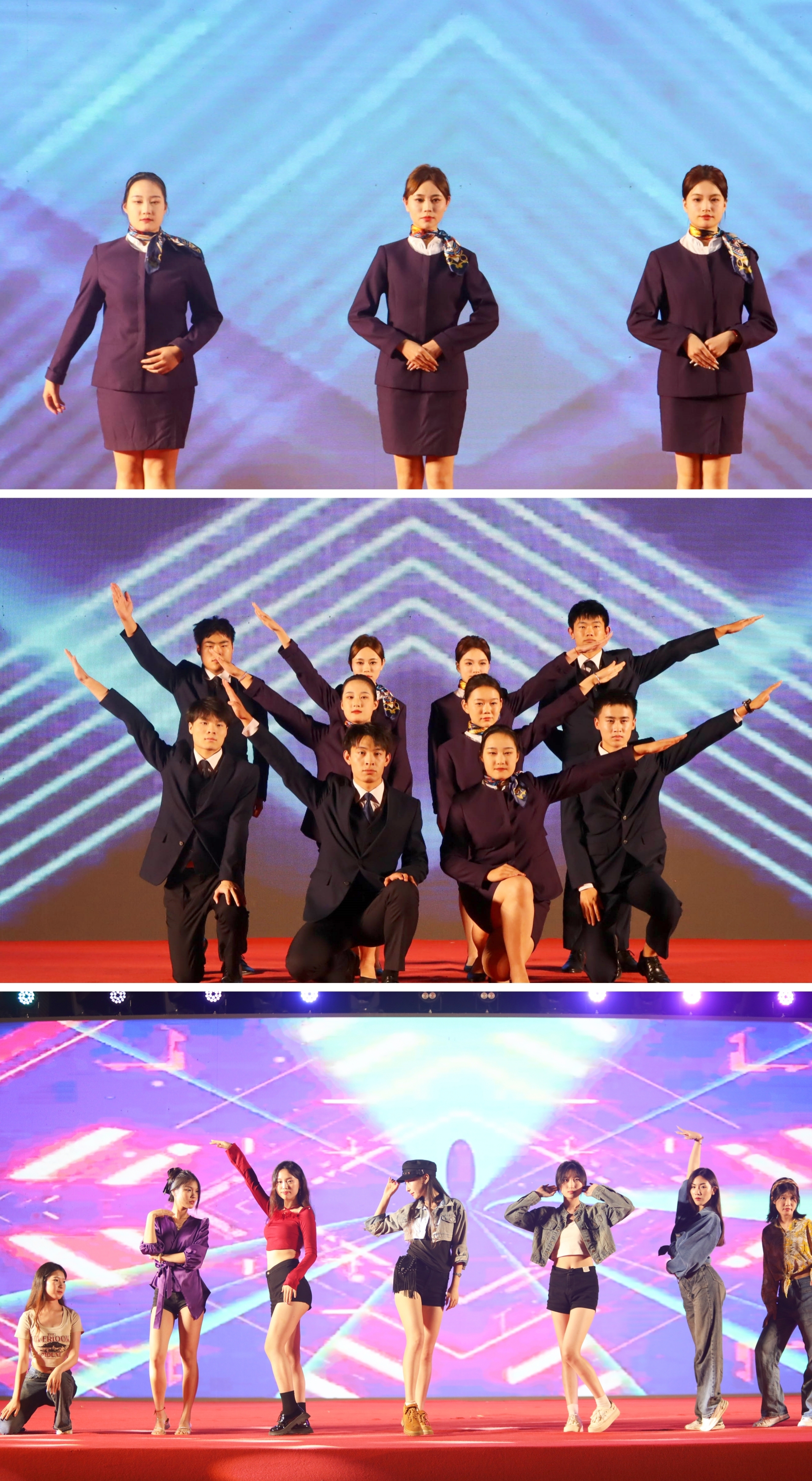 晚会在正舞堂的舞蹈《lightning》中拉开序幕,闪耀的灯光伴随着音符而舞动,整个晚会的热情被全部点燃。紧接着,一首《爱的回归线》将大家的心连在一起,让心灵在音符中得到宁静。舞蹈《卿卿日常》是少女们充满青春魅力的舞动,婉转温柔的舞步迎风而起,裙衣随风摇摆,宛如画卷般唯美。朗诵《书写青春华章》歌颂少年们肩负青春的使命,用奋斗书写铿锵的篇章,用诗歌点亮青春,闪耀出独特的光芒。《华夏龙》是教官们带来的精彩表演,金色的龙狮翻腾起舞,赢得现场阵阵掌声。《青春年代》是2022级空乘专业学长学姐们带来的优雅礼仪秀,举手投足间尽显职业范,令人过目不忘。