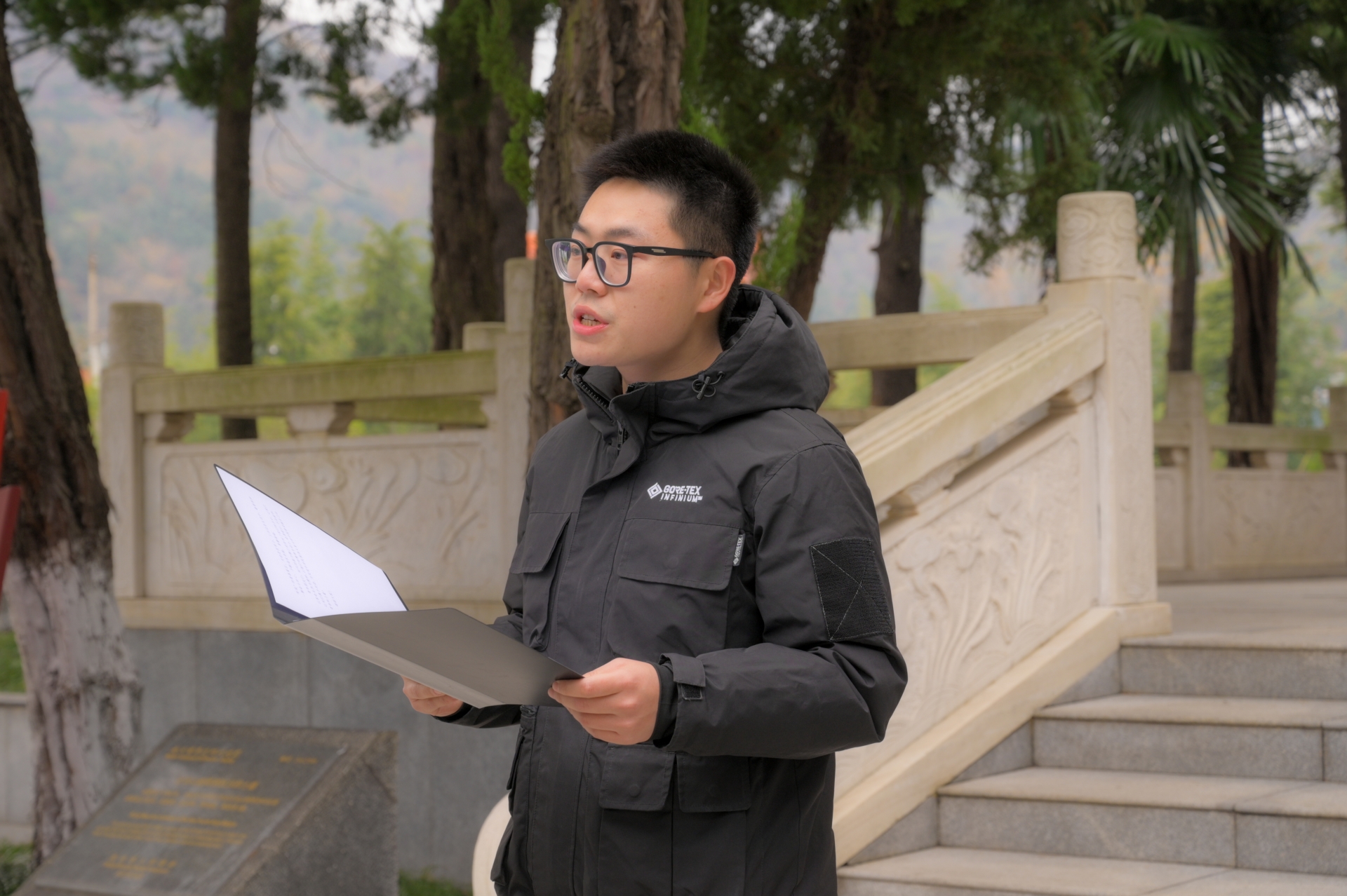 院学生会主席团成员李雨欣同学带领全体团员青年高举右拳,重温入团誓词。在革命烈士纪念碑下喊出铿锵有力的誓言,展现出自己作为中华儿女的信心与决心,缅怀革命先烈,追昔抚今,踔厉前行。