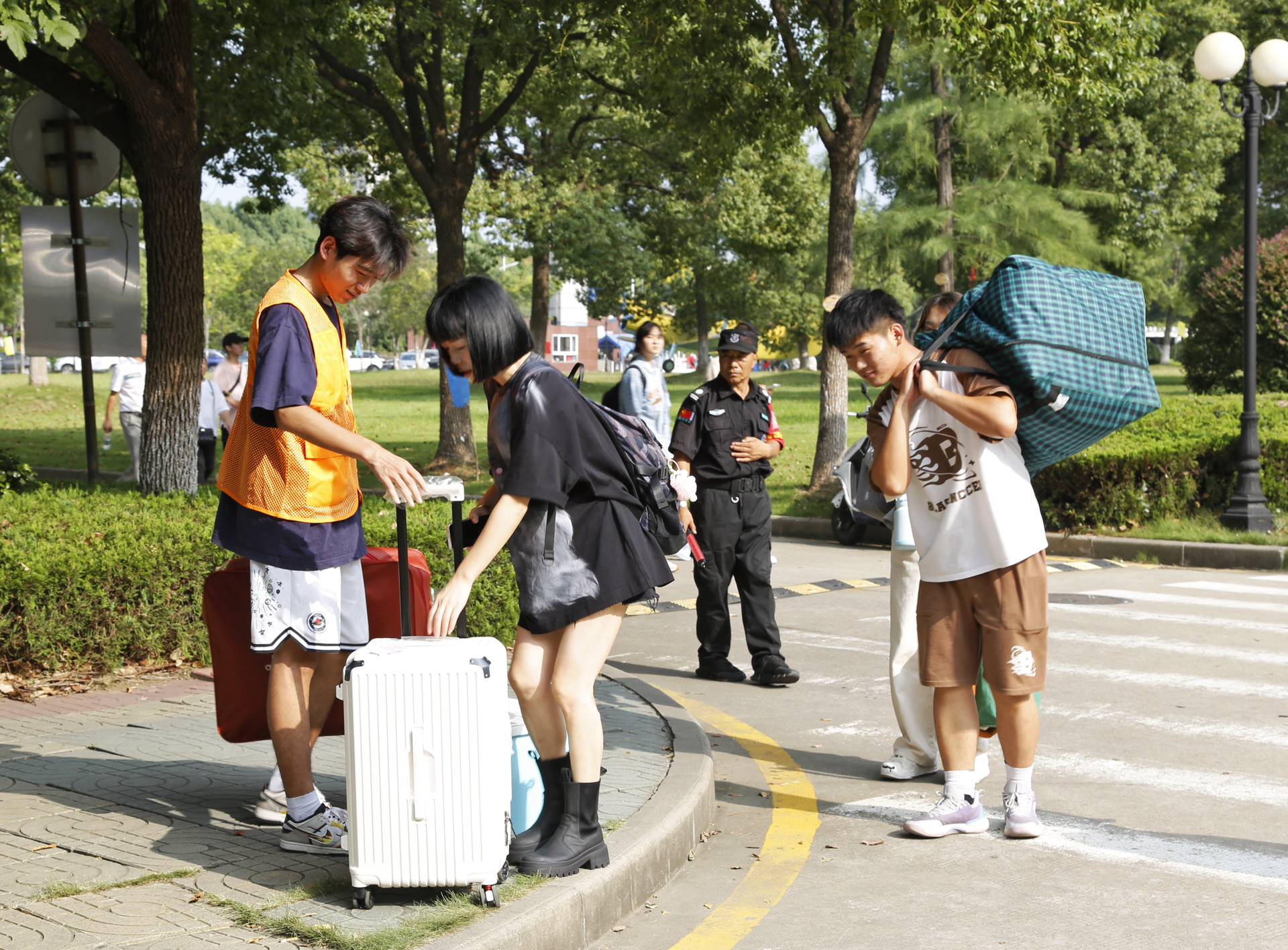 9月7日下午,迎新工作正式开始,校园里彩旗飘扬,迎新标语亮眼醒目,处处洋溢着青春与活力。在现场,迎新各项工作有序展开。为了方便选择公共交通到校的新生及家长,黄色直播 在公交车站点及地铁站设置了志愿者接待,在学校门口安排工作人员引导自驾来校的学生及家长有序进入;各系报到点热火朝天,为新生答疑解惑,帮助大家顺利完成报到;学院大门口、迎新报到点、学生公寓,随处可见身着不同颜色马甲志愿者们忙碌的身影,各个社团也为2023级新生们带来了精彩的现场展示;可爱的小正机器人“校园小卫士”也在迎新现场进行校园引导、防诈宣传等工作。
