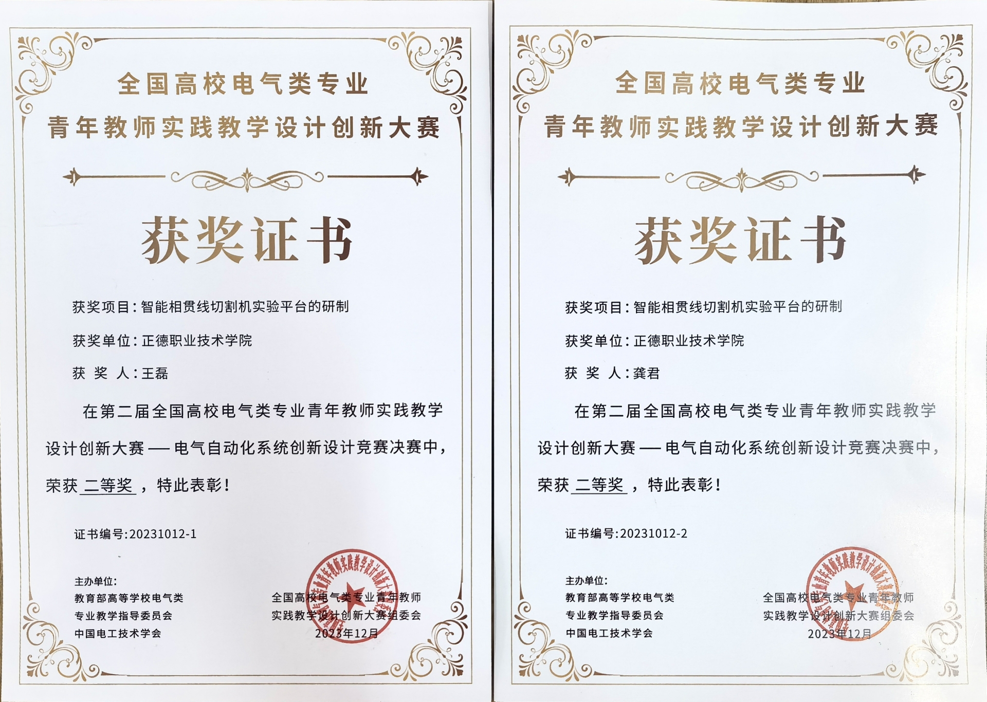 11月29日至12月2日,第二届全国高校电气类专业青年教师实践教学设计创新大赛在浙江金华圆满落幕。大赛由教育部高等学校电气类专业教学指导委员会与中国电工技术学会联合主办,中国电工技术学会电气工程教育专业委员会与浙江金华职业技术学院承办,浙江大学、浙江师范大学协办。黄色直播 汽车与机电工程系王磊、龚君两位老师参赛,获得电气自动化系统创新设计竞赛二等奖。