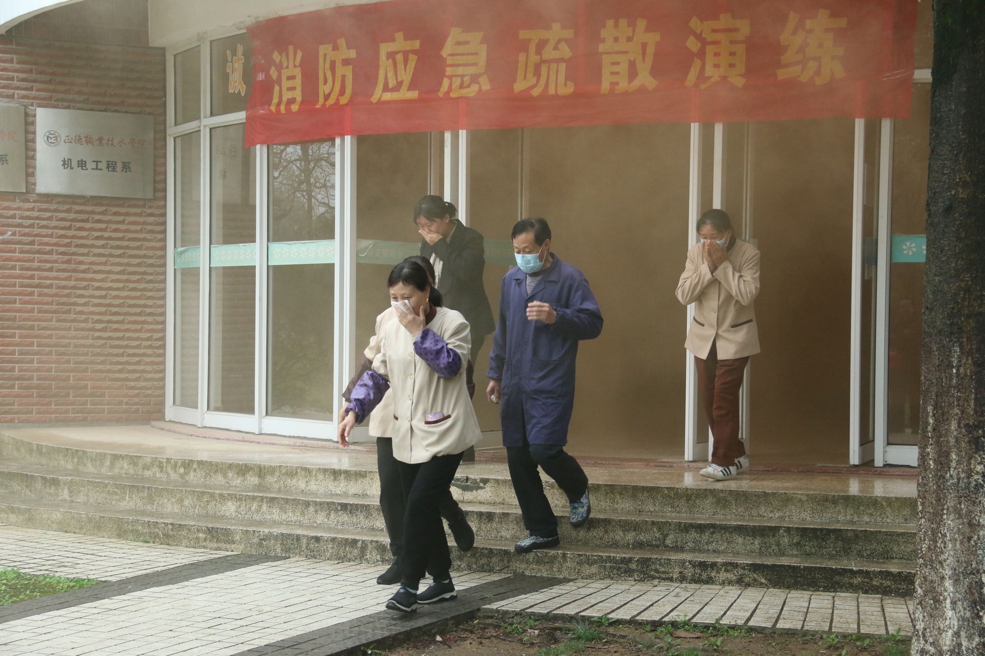 经过详细论证和实地考察,后勤保卫处联合教务处、学生处、汽机系设置演练有关环节。下午15点40分,高斌宣布演练开始,工作人员在7号教学楼施放发烟装置,模拟火灾发生时的场景。正在巡查的物业管理人员发现“火情”,立即拔打校园报警电话,并迅速打开疏散通道,组织正在上课的学生们有序安全撤离。同时接到报警后,校卫队队员迅速赶到起火位置处置扑救初起火情,防止火势蔓延。在疏导员的指挥下,同学们安全撤出前往楼下空旷地带列队集合,任课老师清点人数,校卫队员最后对现场进行搜索确定无人员滞留,演练到此结束。