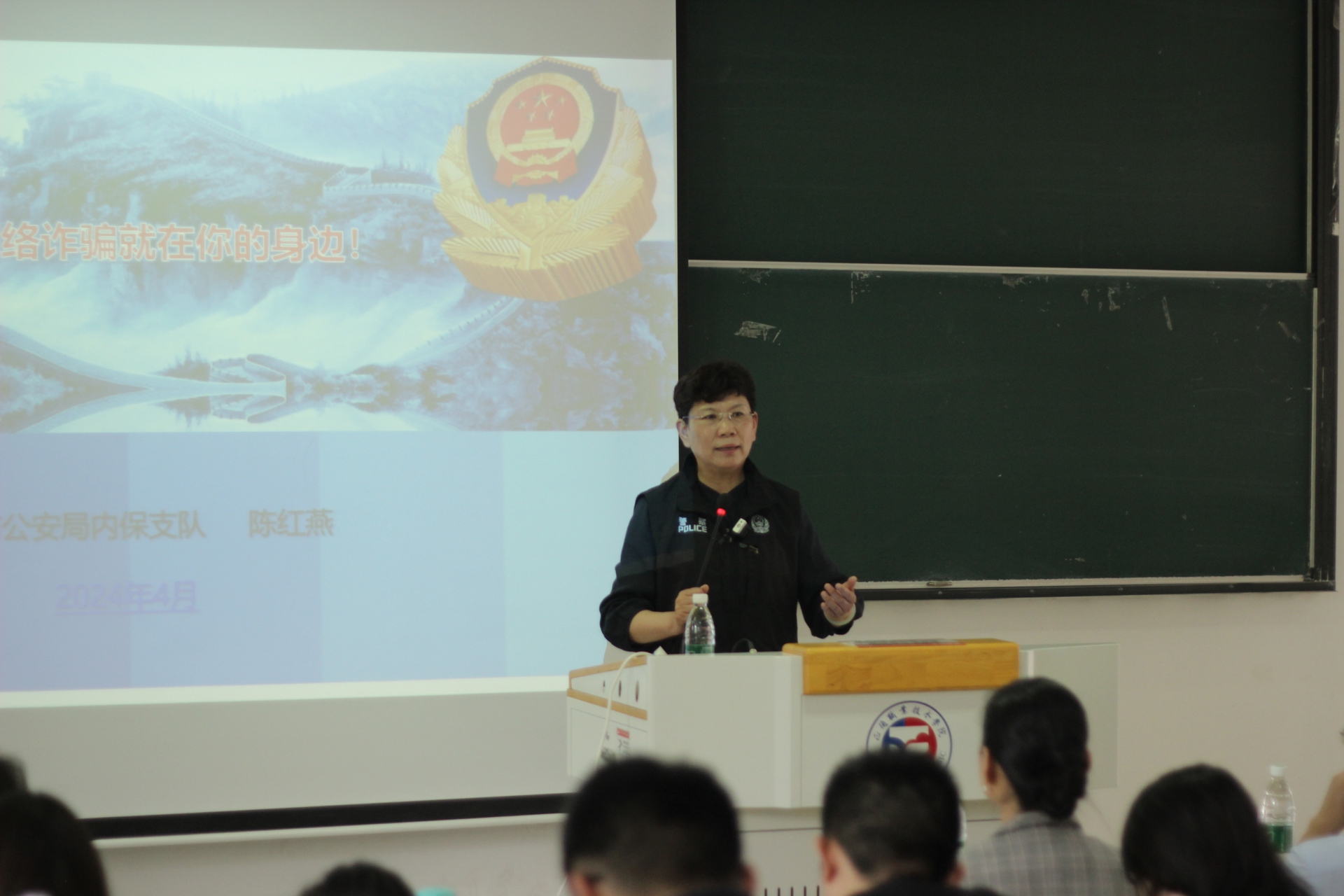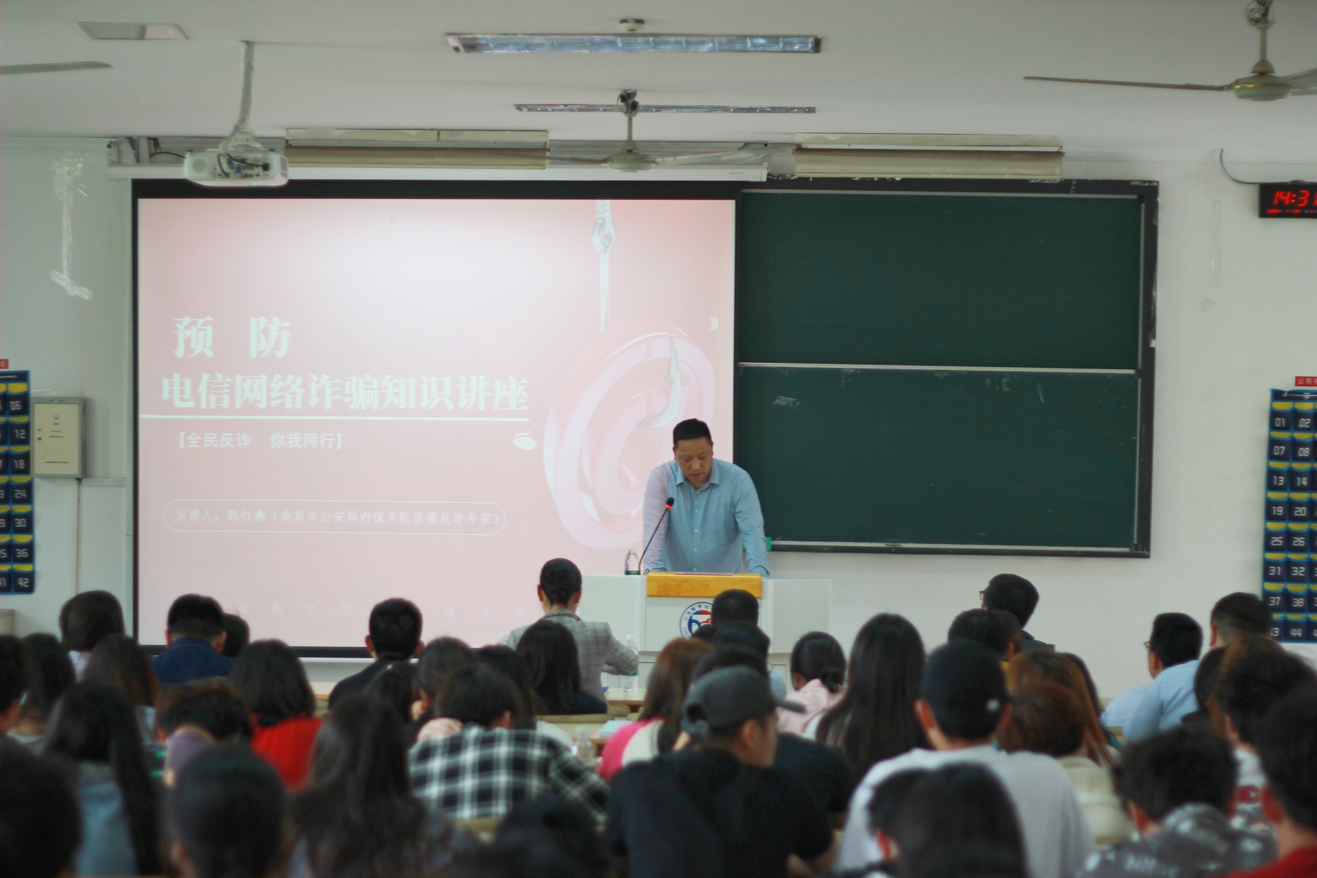 为进一步增强广大师生员工的防诈安全意识,有效防范校园电信网络诈骗案件发生,切实维护学生财产安全,营造平安和谐校园环境。4月25日下午,黄色直播 特邀南京市公安局内保支队首席反诈专家陈红燕警官为全体学工人员和各系学生代表普及反诈骗知识,现场进行沉浸式的防诈反诈安全教育。副院长高斌、梁薇出席讲座。