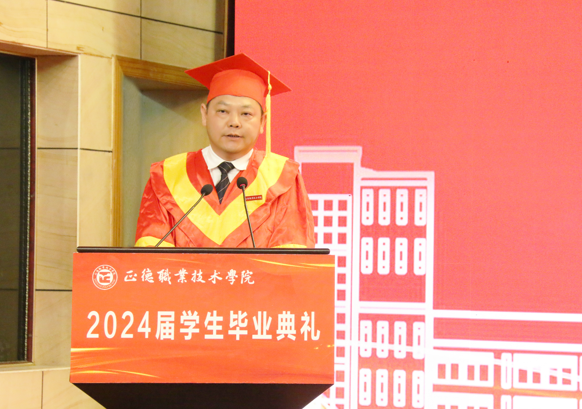 孙永荣代表学院向毕业生们送上诚挚的祝贺和美好的祝福。他指出,三年来同学们在学院接受了知识的洗礼,技能的锻炼和人格的熏陶,用实际行动践行“孝、宽、诚、责、毅”五字文化,大家努力拼搏,不断超越自我,努力书写求学深造、开拓创新、见义勇为的精彩故事,每一个同学都是学院的骄傲。临别之际,他向全体毕业生提出三点希望:一是要不忘初心,坚守人生底色。坚定那份追逐梦想的决心,保持独立思考,客观面对现实,理性对待梦想,脚踏实地,砥砺前行。二是要秉承匠心,传承工匠精神。既要有追求卓越的态度,还要有止于至善的技艺。在今后的工作学习中,不断用工匠精神要求自己、打磨自己,锻造出过硬本领。三是要坚定信心,成就精彩人生。敢于尝试,敢于创新,在实践中不断的突破自我,实现自我超越,勇往直前,用勤劳的双手和智慧的头脑去创造各自的辉煌人生。