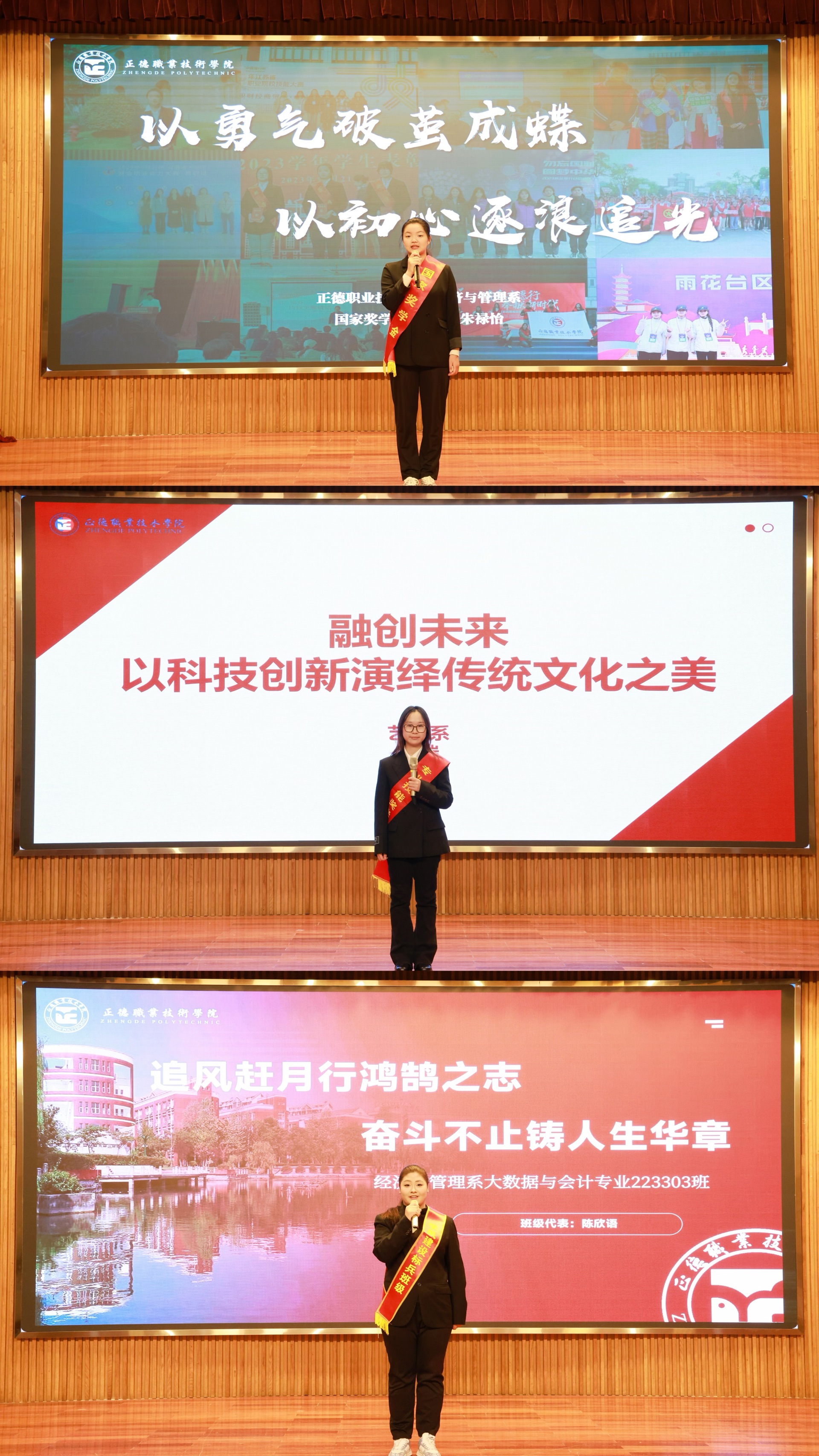 国家奖学金获得者代表朱禄怡同学以“勇气破茧成蝶 初心逐浪追光”为题,讲述了自己怀揣梦想、驰而不息的学习、实践经历,她告诉大家只要勇于尝试、坚持不懈,总能成为更好的自己;院长通令嘉奖获得者代表黄瑞同学以“融创未来,以科技创新演绎传统文化之美”为题,分享了获奖团队参加2024年度的海峡两岸暨港澳地区大学生计算机创新作品赛总决赛并取得国赛一等奖的经历;学风建设标兵班集体代表陈欣语同学以“追风赶月行鸿鹄之志 奋斗不止铸人生华章”为题,告诉所有正德学子,滴水穿石非一日之功,成绩属于过去,未来仍是征程,要牢记“正德厚生”的校训,让“正德人”成为身上最闪亮的勋章。