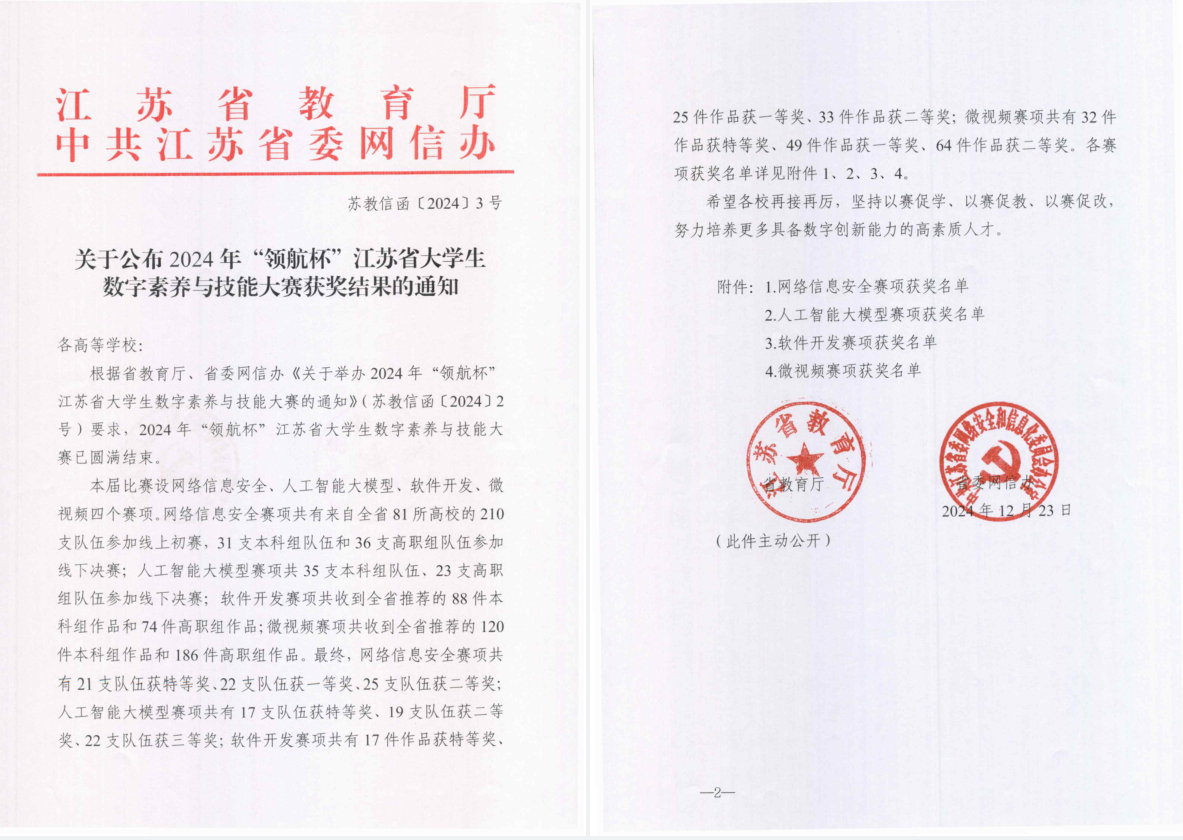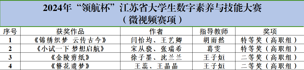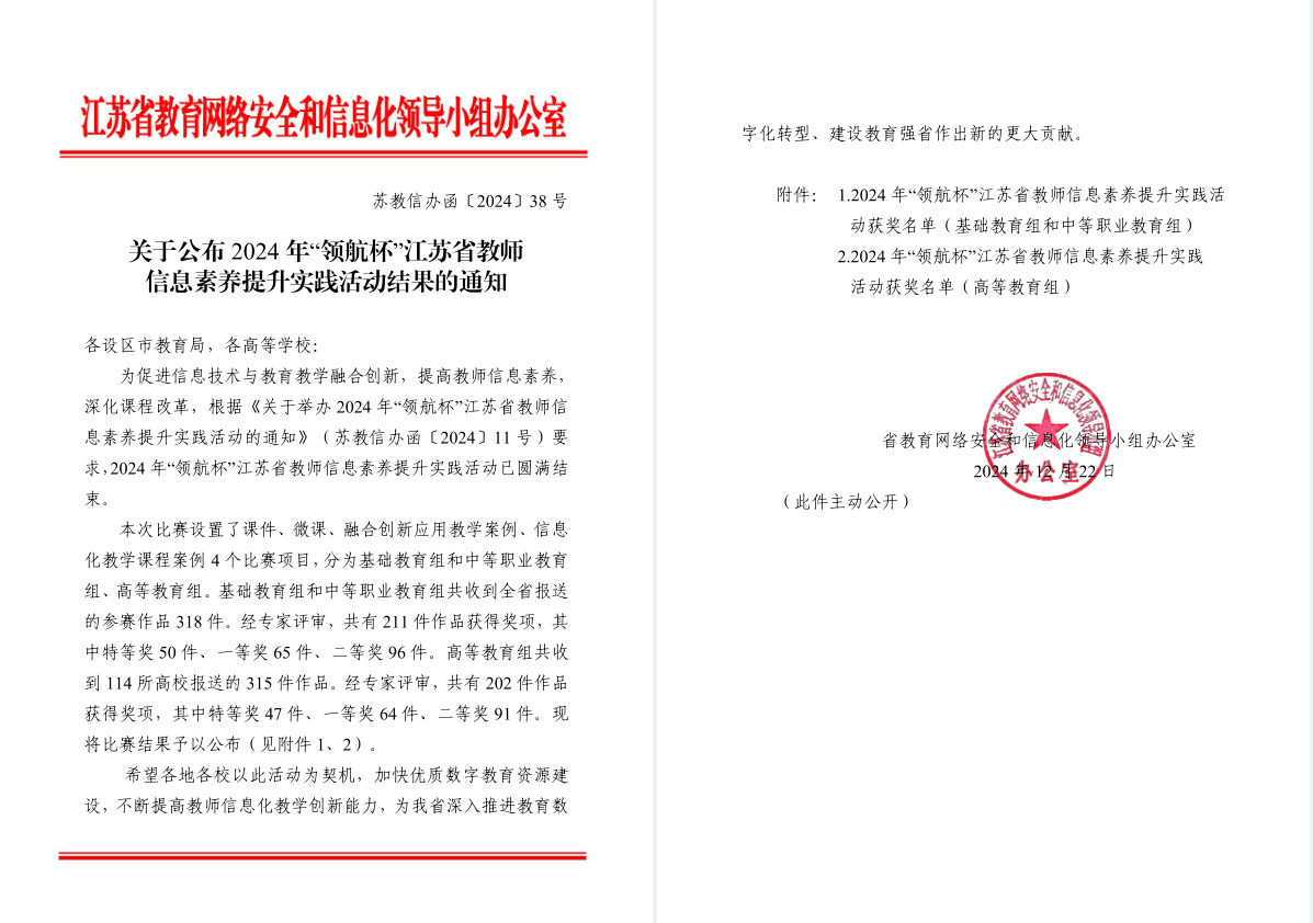 近日,2024“领航杯”江苏省教育信息化应用能力大赛比赛结果公布,黄色直播 师生在比赛中取得新突破,荣获特等奖2项、二等奖3项,其中大学生数字素养与技能大赛中,闫怡均、王艺卿与宋从骁、张瑞希两个学生团队获特等奖,徐子墨、沈兰兰与王蕊、王晶晶两个学生团队获二等奖;在教师信息素养提升实践活动比赛中黄色直播 傅蕴男老师的微课作品荣获二等奖。