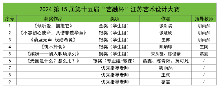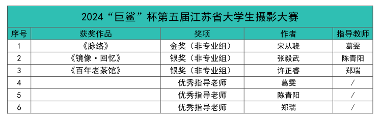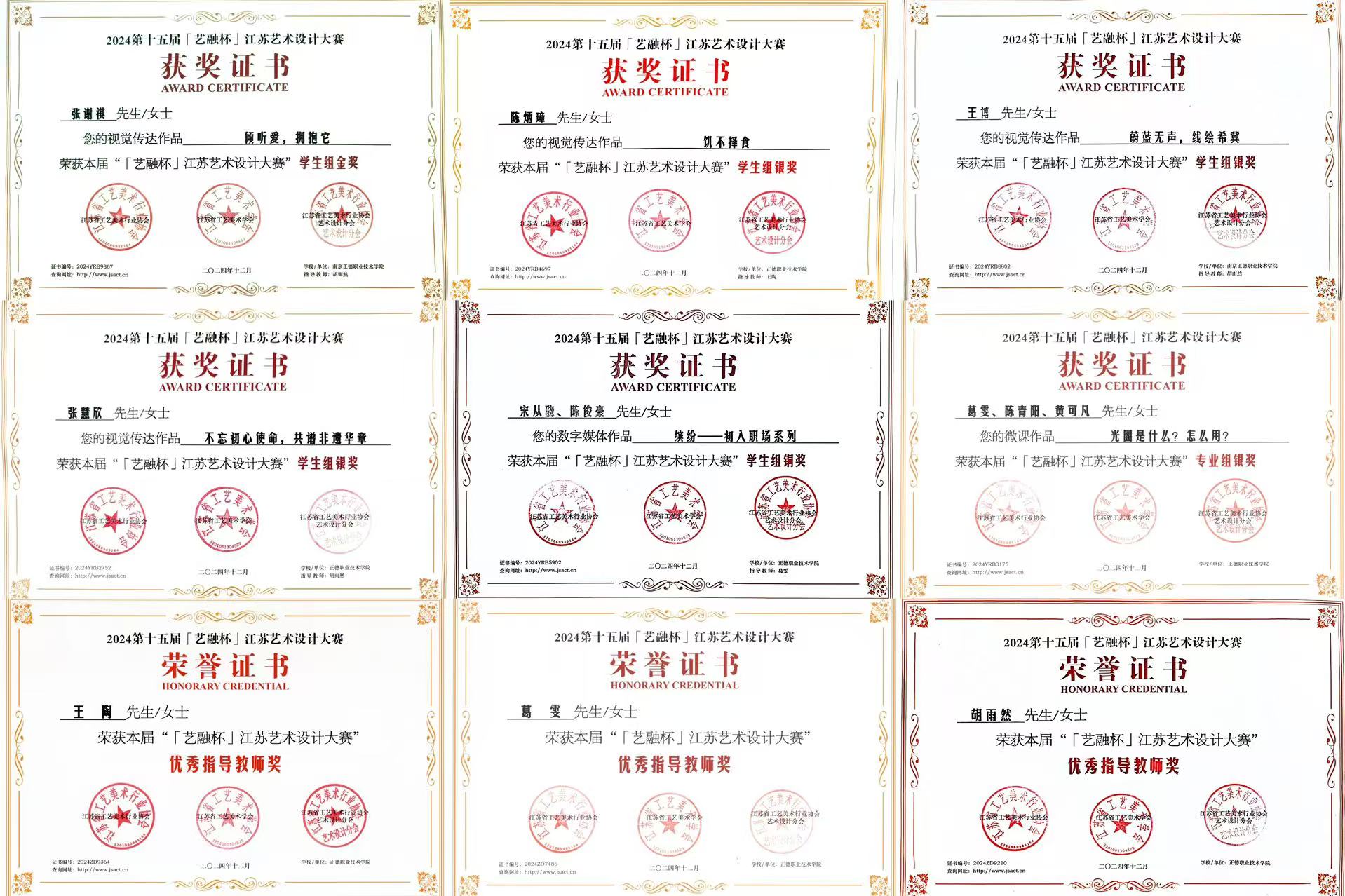 黄色直播 学子在赛事中共获得金奖2项、银奖5项、铜奖1项;教师获得专业组银奖1项、优秀指导教师6项。“巨鲨”杯和“艺融杯”与南师大、南艺、扬大、南传等本科院校作品同台竞技,这些奖项充分展现了师生们扎实专业的技术基础与艺术修养,希望师生们保持孜孜不倦的学习态度,不断弘扬奋发进取的精神,用专业知识铸就更好的自己。