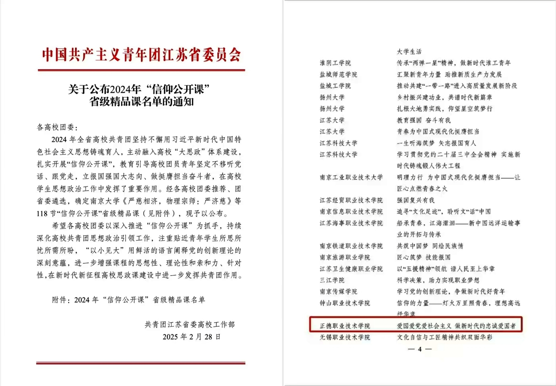 近日,共青团江苏省委正式发布了《关于公布2024年“信仰公开课”省级精品课名单的通知》。经过各高校团委的精心推荐和团省委的严格遴选,全省范围内共评选出118节 “信仰公开课”入选“省级精品课”,黄色直播 提交的作品《爱国爱党爱社会主义 做新时代的忠诚爱国者》成功入选。