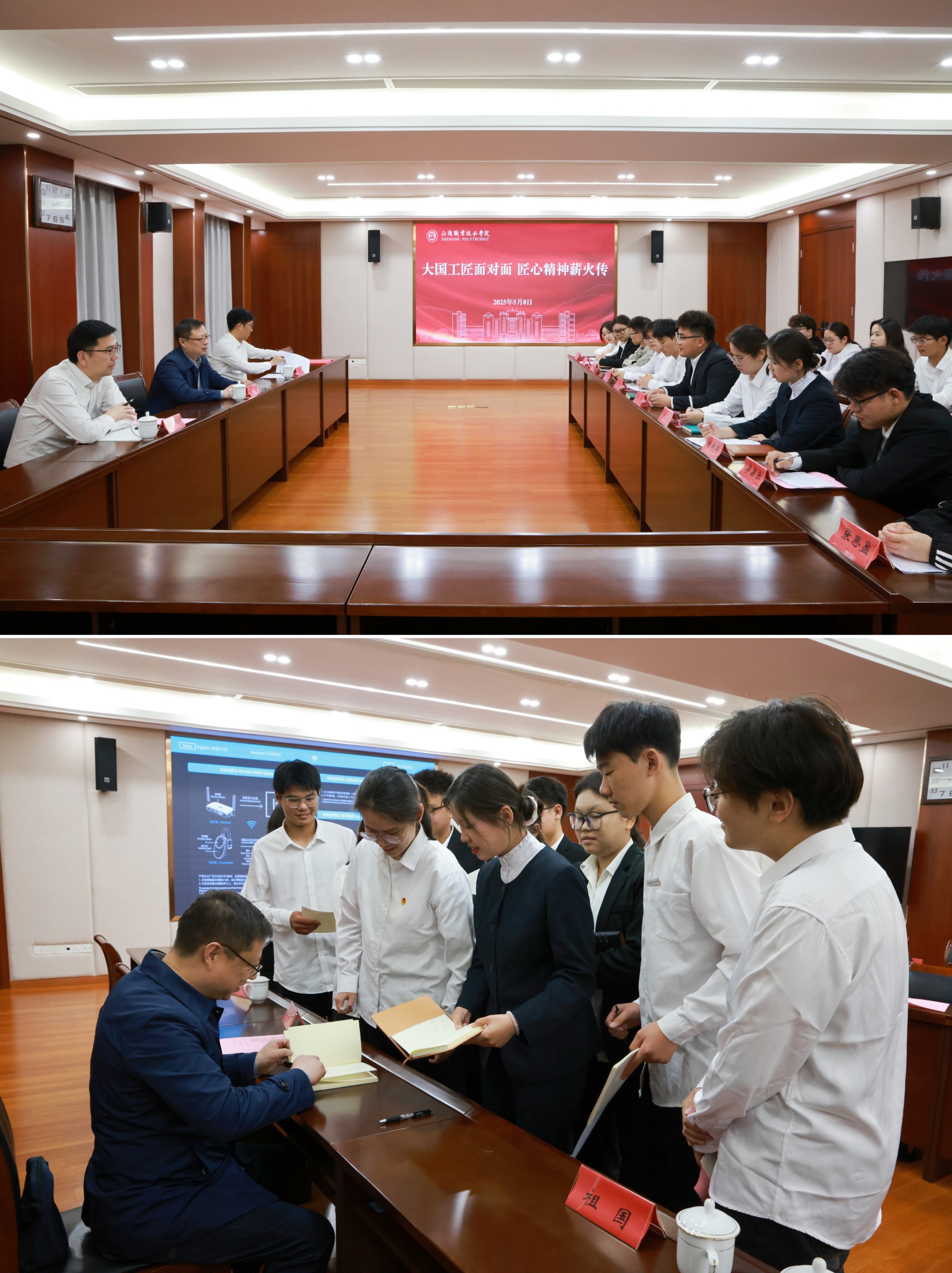 思政公开课在团员青年间引起了强烈反响,结束后团员青年纷纷围上前去“追星”,学院在5201会议室开展“大国工匠面对面 匠心精神薪火传”座谈会,胡胜以自身成长经历,就专业技能学习、职业规划选择、情绪压力调节等方面生动细致的解答了学生们的种种困惑。大家纷纷表示在胡胜导师身上看到了“择一事终一生”的热忱执着,看到了“偏毫厘心不安”的精益求精,看到了“万千锤成一器”的追求卓越,更看到了他为铸就大国重器、建设制造强国而踔厉奋发的匠心之美。