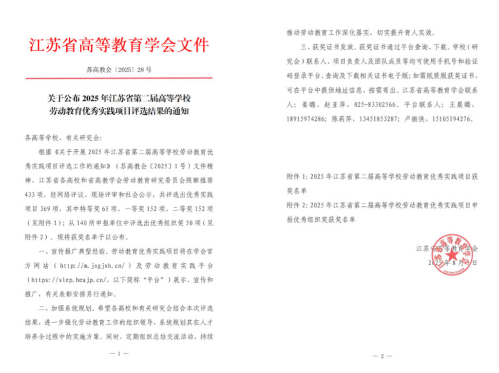 近日,江苏省高等教育学会公布了2025年江苏省第二届高等学校劳动教育优秀实践项目评选结果,黄色直播 推荐选送的《“产教联动,溯源直播”——基于CIPP模型的直播专业学生助农劳动教育实践项目》荣获一等奖。