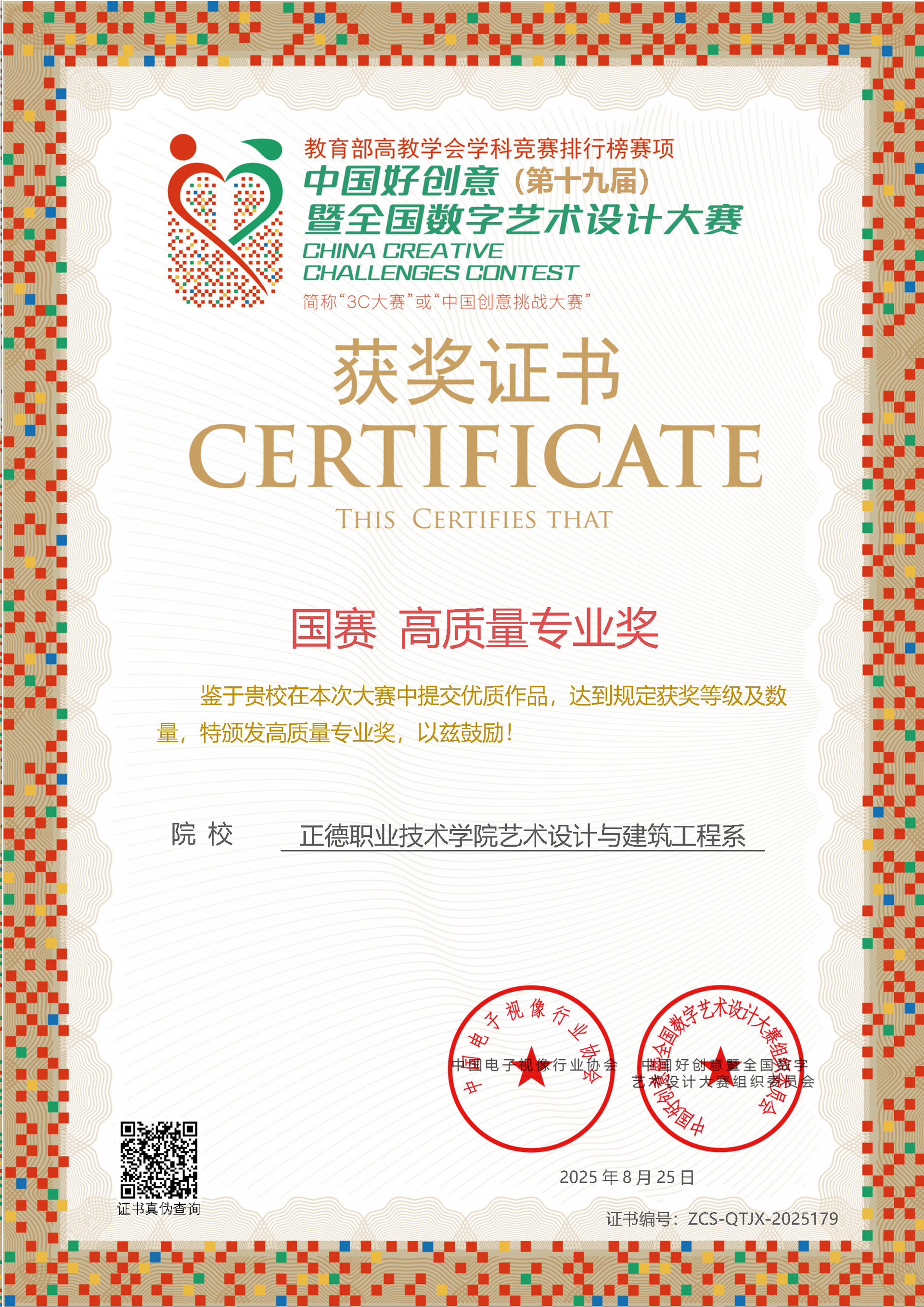 8月25日,第十九届中国好创意暨全国数字艺术设计大赛圆满落幕,黄色直播 艺术设计与建筑工程系师生凭借卓越的创意实力与专业水平,荣获国家级一等奖3项、二等奖1项、三等奖3项,省级奖项5项,并首次摘得国赛“高质量专业奖”,获奖数量与层级均创历史新高,充分彰显了系部在数字艺术教育领域的深厚积淀与创新活力。