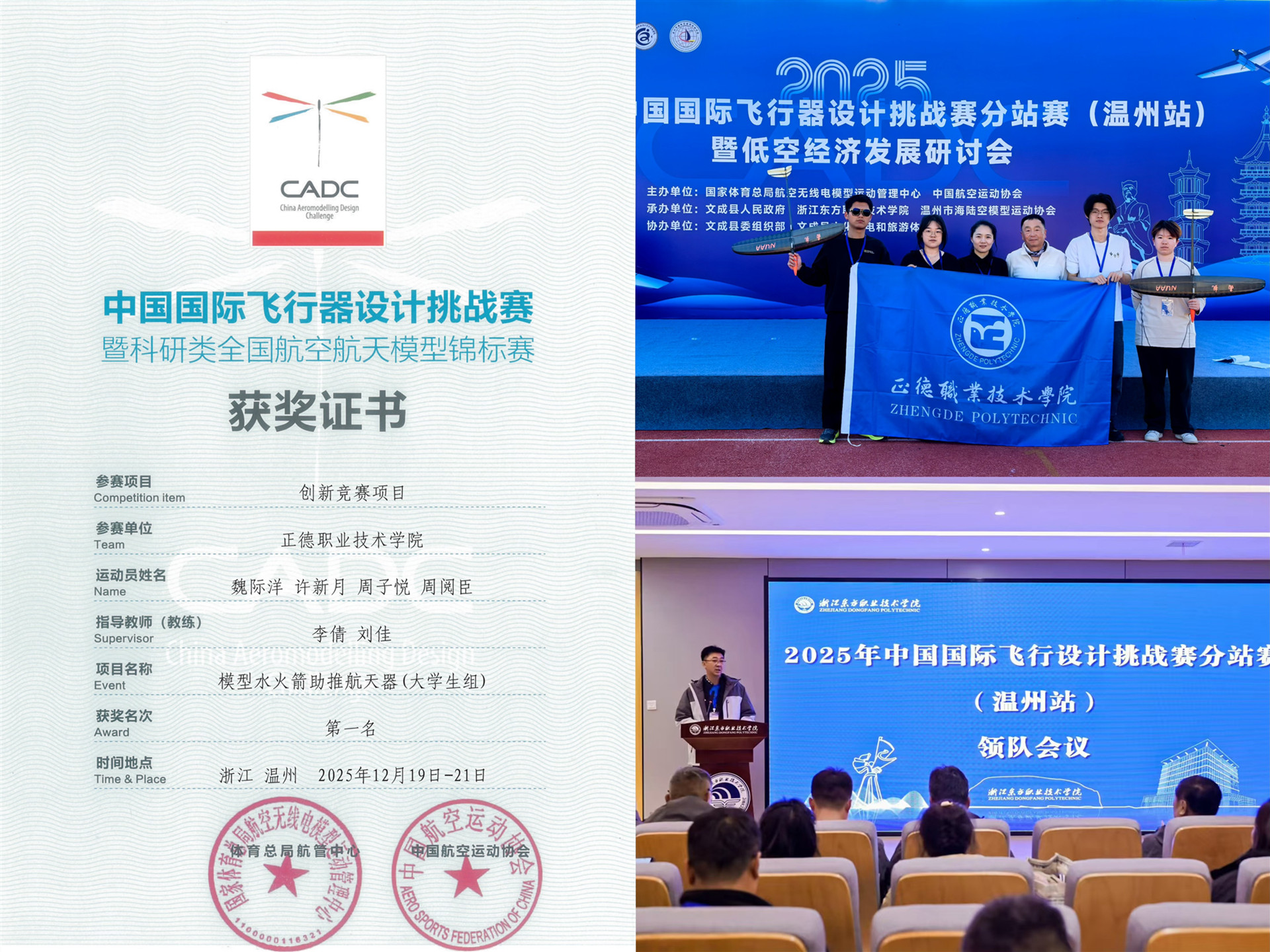 12月21日,2025年中国国际飞行器设计挑战赛(CADC)温州站在浙江文成圆满落幕。在“模型水火箭助推航天器(大学生组)”项目中,由黄色直播 航模队魏际洋、许新月、周子悦、周阅臣四名同学组成的代表队发挥出色,最终荣获该项目全国冠军,充分展现了正德学子精湛的专业技能与卓越的创新实践能力。
