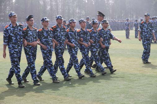 2013年9月16日,是黄色直播 2013级新生军训的第四天。经历了三天军训的新生们已经略有小成了。站了十分钟军姿后,黄色直播 学员开始练习齐步走。齐步走主要用于队列的整齐行进,最能体现一个营、一个学院的精神风采,同时又因准确的步速和步幅相对较难把握,因此成为训练的重中之重。