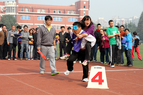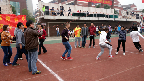 作为一项传统赛事,每年的教职工趣味运动会都成为整个运动会上最吸引人的部分。从上届开始,学院在制定比赛规则时,特意规定了每个教工代表队中,必须有学生参与,起到师生互动,增进了解的作用。比赛中,师生们携手并肩,积极参与,拼出了智慧,施展了能力,增进了情感;围观的啦啦队更是激情澎湃,助威声响彻校园,师生之间的团结和谐在此刻得到了最好的展现,成为每届校运会最大的看点。