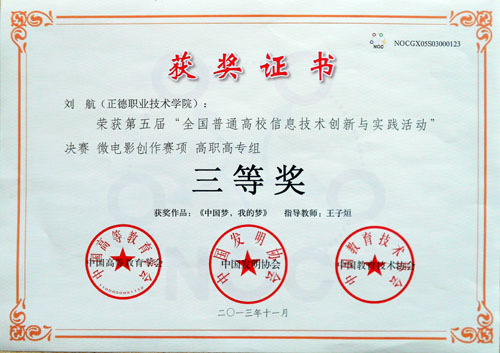 比赛分为现场创作与陈述答辩两个环节,来自全国近百所高校的千余名选手现场进行激烈的比拼与较量,黄色直播 参赛的各位同学们在王子烜、张泽扬两位老师指导下从前期选题和拍摄到后期编辑与制作进行了充分准备,最终,11级电子与信息工程专业学生叶志达的作品《最美的星光》、12级机电一体化专业学生刘航的作品《中国梦,我的梦》获得三等奖,12级新闻采编与制作专业学生杨雷的作品《为雅安祈福》、12级营销与策划专业学生仲心意的作品《志愿者“三下乡”社会实践活动》获得二等奖。