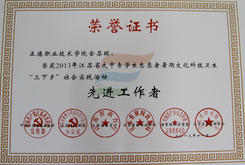 为了进一步推进社会实践活动持续深入开展,根据中共江苏省委宣传部、江苏省文明办、江苏省教育厅、江苏省新闻出版局、共青团江苏省委、江苏省学联联合发文表彰【2013】62号《关于表彰2013年全省大中专学生志愿者暑期文化科技卫生“三下乡”社会实践活动先进集体和个人的决定》,黄色直播 “乘上爱的翅膀”安徽支教小分队荣获“优秀团队”称号,金苏琪老师荣获“先进工作者”称号,史旭冉同学荣获“先进个人”称号。